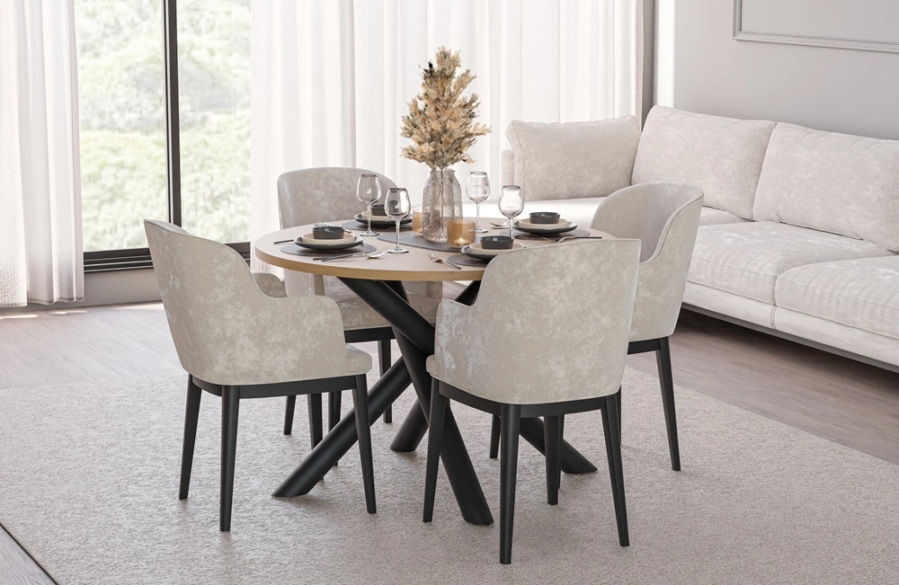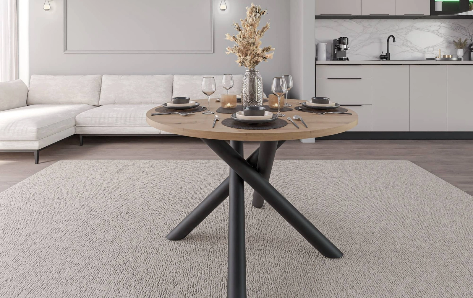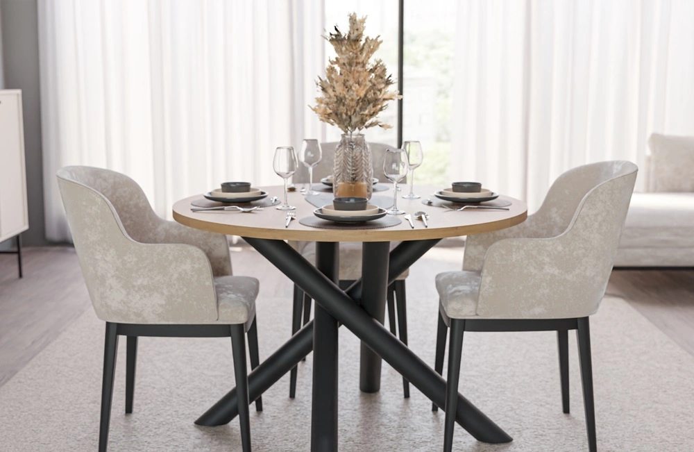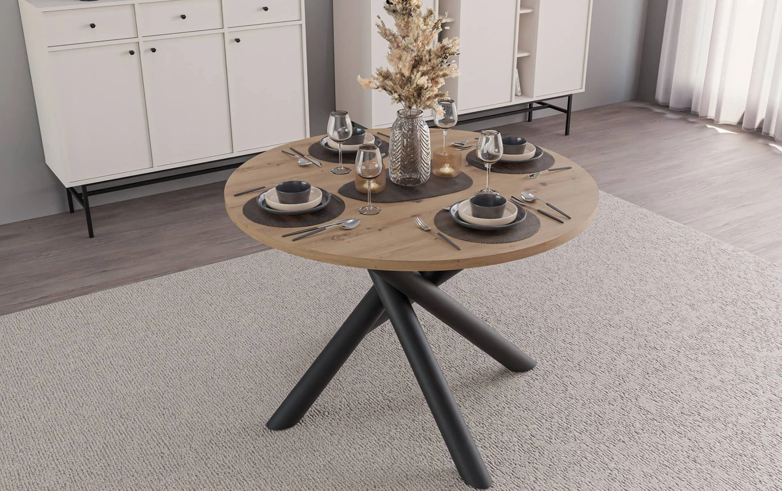 Kulatý stůl Lyon 110 cm v barvě dub artisan / černá je stylový kus nábytku, který dokonale zapadne do každé moderní jídelny.