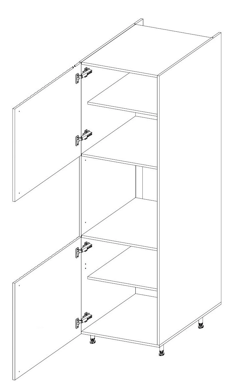 Vysoká kuchyňská skříňka se dodává po částech, které jsou zabaleny v pětivrstvé lepenkové krabici. Veškeré kování potřebné k montáži, tj. šrouby, vruty, hmoždinky, panty, úchytky, zátky, je přibaleno společně s komponenty kuchyňské skříňky.