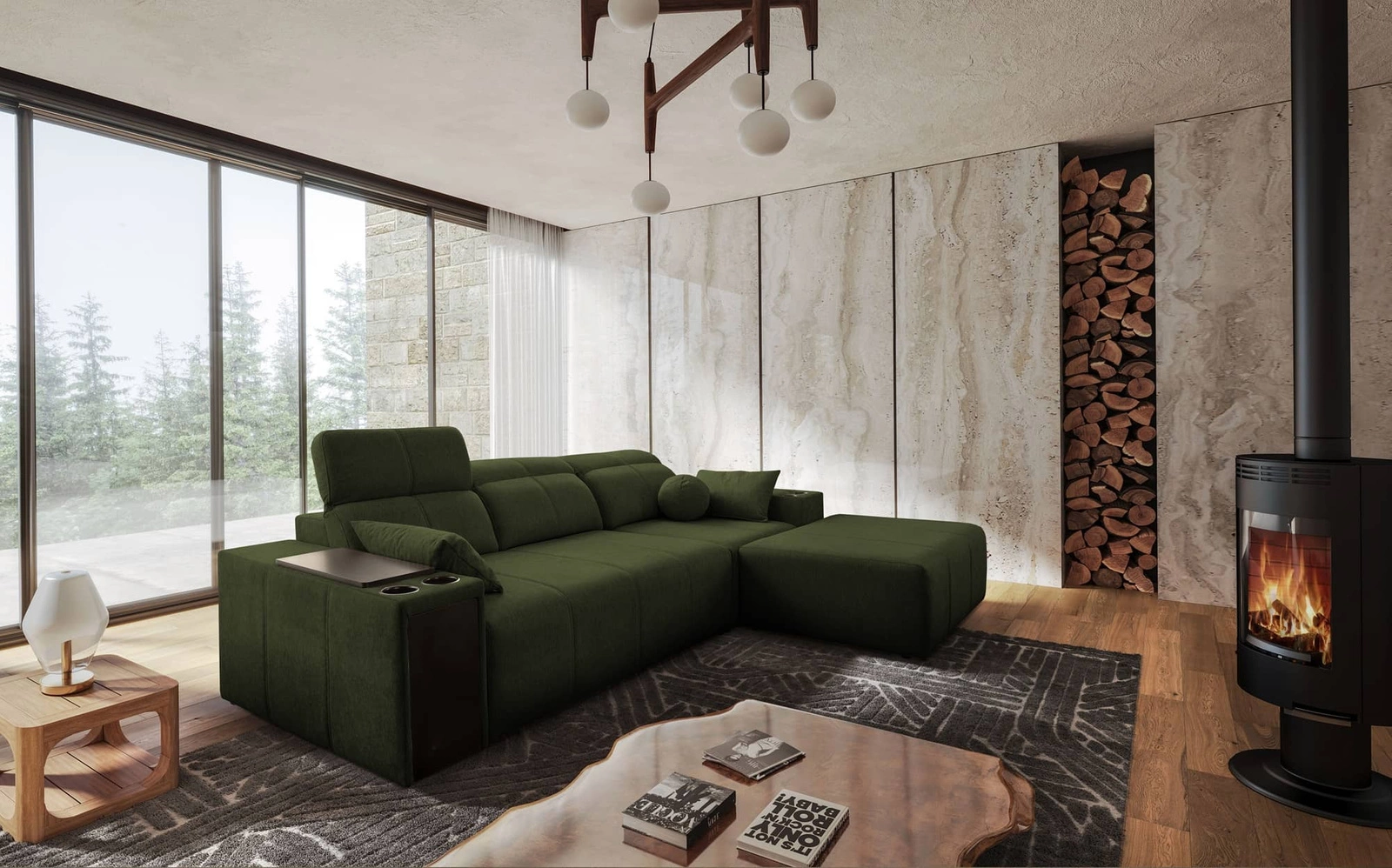 Rohová pohovka Tesalia v zelené barvě je vysoce funkční kus nábytku se stylovou povrchovou úpravou.
