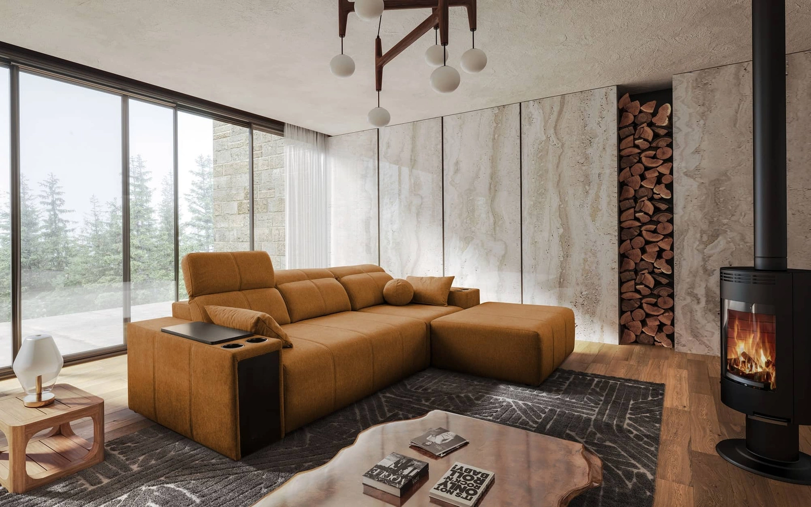 Rohová pohovka Tesalia v medové barvě je mimořádně funkční kus nábytku se stylovou povrchovou úpravou.