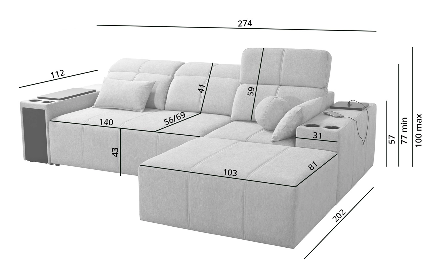 Rozměry nábytku umožňují vyplnění prostoru v prostorném obývacím pokoji nebo zasedací místnosti. Šířka rohu 274 cm, maximální výška 100 cm a hloubka 202 cm. Spací plocha rohové jednotky je 138x212 cm. Výška sedadla nábytku je 43 cm a maximální výška opěradla je 59 cm. Vlnité pružiny a polyuretanová pěna T30 je materiál, z něhož je vyrobeno sedadlo rohu. Zádová opěrka s nastavitelnými opěrkami hlavy vám umožní snadno nastavit úhel opěrek hlavy podle vašich preferencí a zaručí pohodlný odpočinek po dlouhém dni, který oceníte vy, vaši blízcí i hosté, kteří si na tuto jedinečnou rohovou sedačku sednou.
