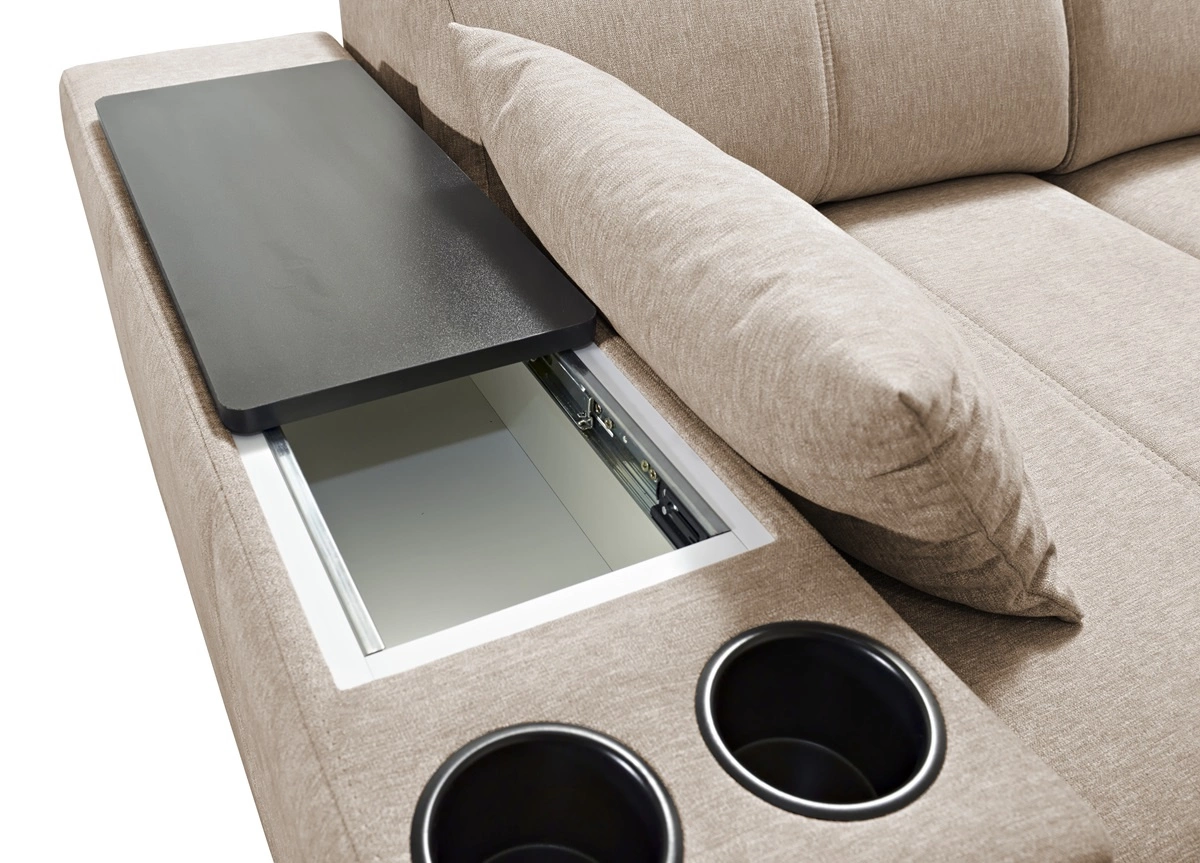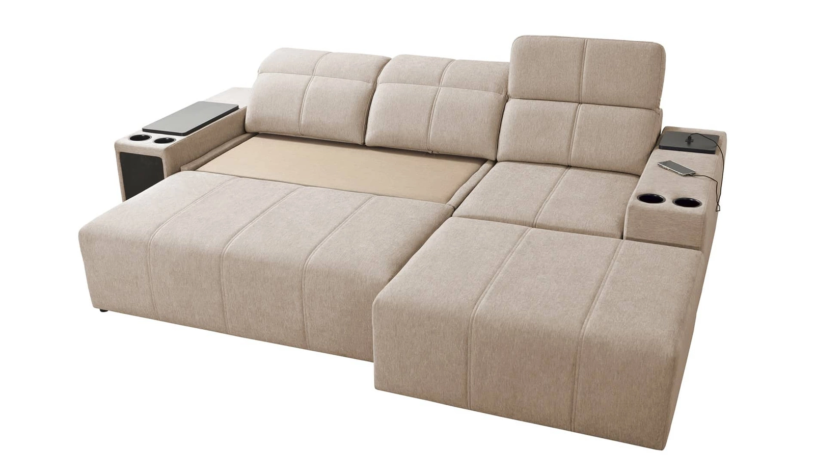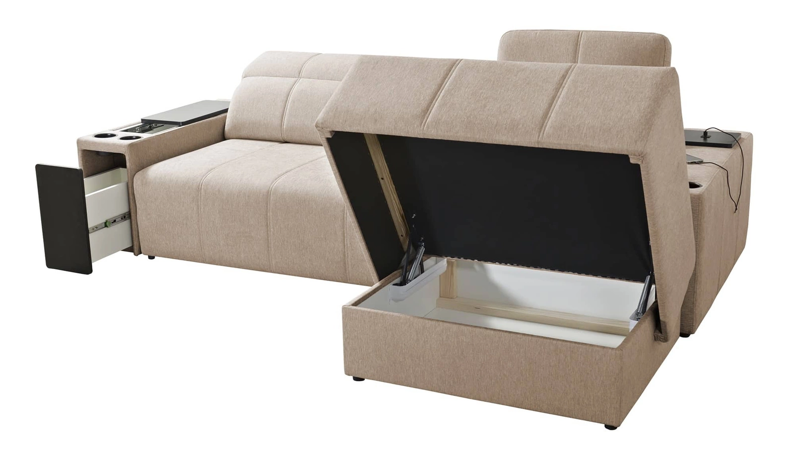 Mezi doplňky tohoto kusu nábytku, které ocení všichni uživatelé, patří nastavitelné opěradlo, které umožňuje nastavit hloubku sedáku, zásuvka a otevírací lišta v boční části rohu, nabíjecí zásuvka USB, držáky na nápoje a nádoba na lůžkoviny.