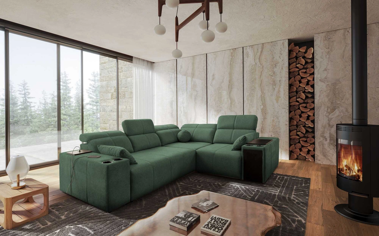 Mezi doplňky tohoto kusu nábytku, které ocení všichni uživatelé, patří nastavitelné opěradlo, které umožňuje nastavit hloubku sedáku, zásuvka a otevírací lišta v boční části rohu, nabíjecí zásuvka USB, držáky na nápoje a nádoba na lůžkoviny.