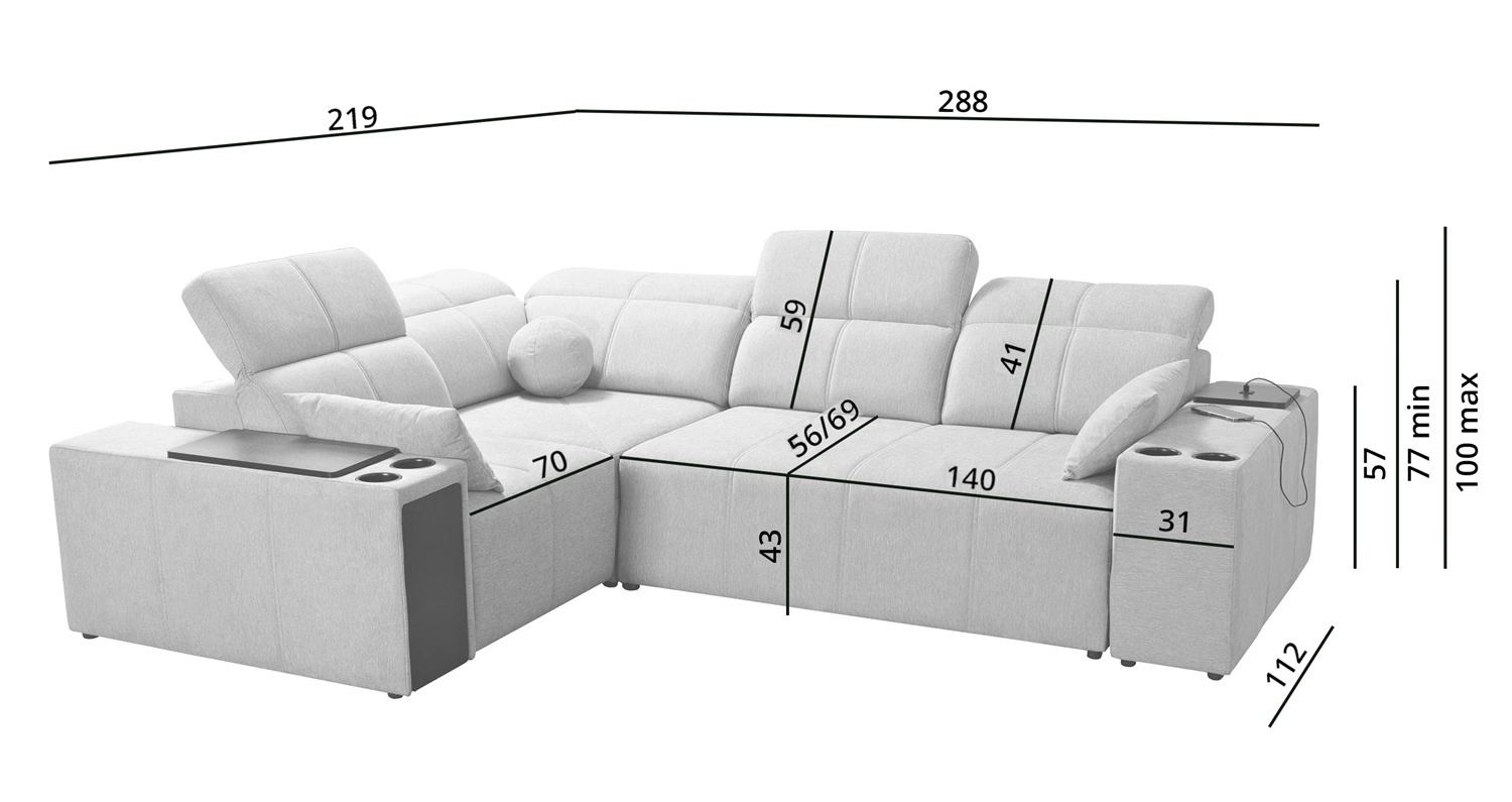 Rozměry nábytku umožňují vyplnění prostoru v prostorném obývacím pokoji nebo zasedací místnosti. Šířka rohu 288 cm, maximální výška 100 cm a hloubka 219 cm. Spací plocha rohové jednotky je 138x212 cm. Výška sedadla nábytku je 43 cm a maximální výška opěradla je 59 cm. Vlnité pružiny a polyuretanová pěna T30 je materiál, z něhož je vyrobeno sedadlo rohu. Zádová opěrka s nastavitelnými opěrkami hlavy vám umožní snadno nastavit úhel opěrek hlavy podle vašich preferencí a zaručí pohodlný odpočinek po dlouhém dni, který oceníte vy, vaši blízcí i hosté, kteří si na tuto jedinečnou rohovou sedačku sednou.