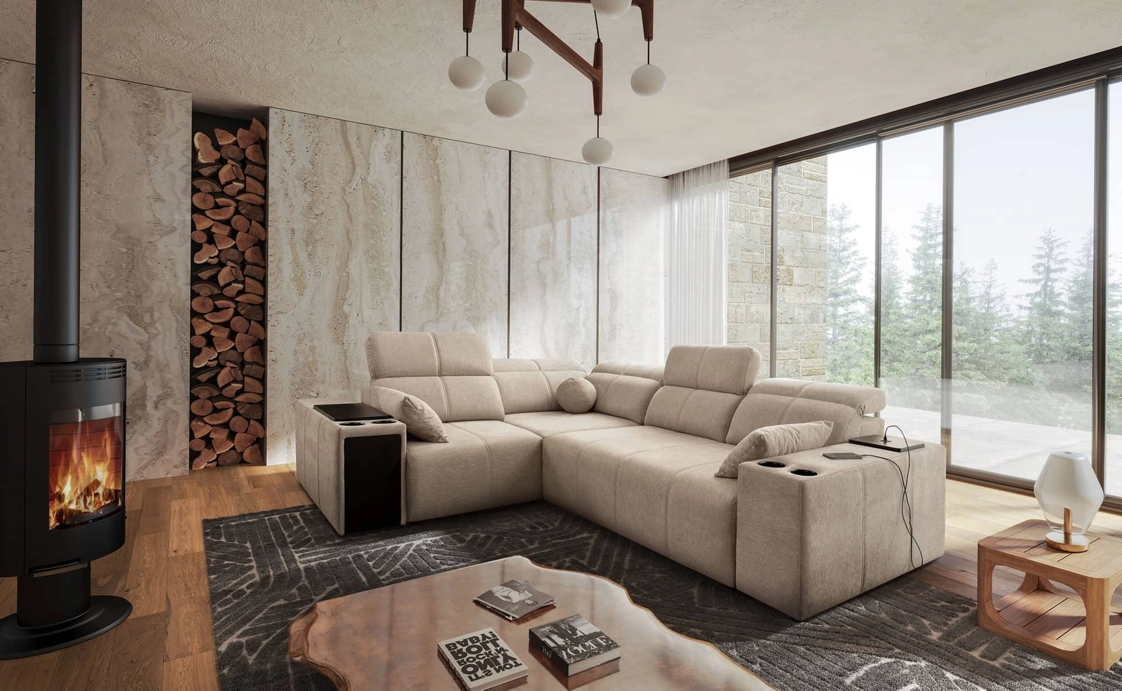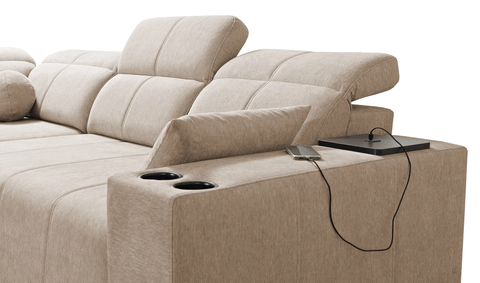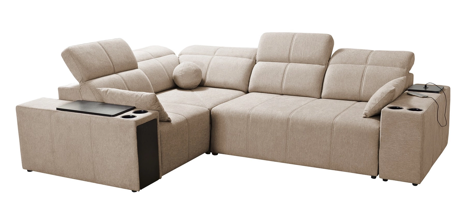 Mezi doplňky tohoto kusu nábytku, které ocení všichni uživatelé, patří nastavitelné opěradlo, které umožňuje nastavit hloubku sedáku, zásuvka a otevírací lišta v boční části rohu, nabíjecí zásuvka USB, držáky na nápoje a nádoba na lůžkoviny.