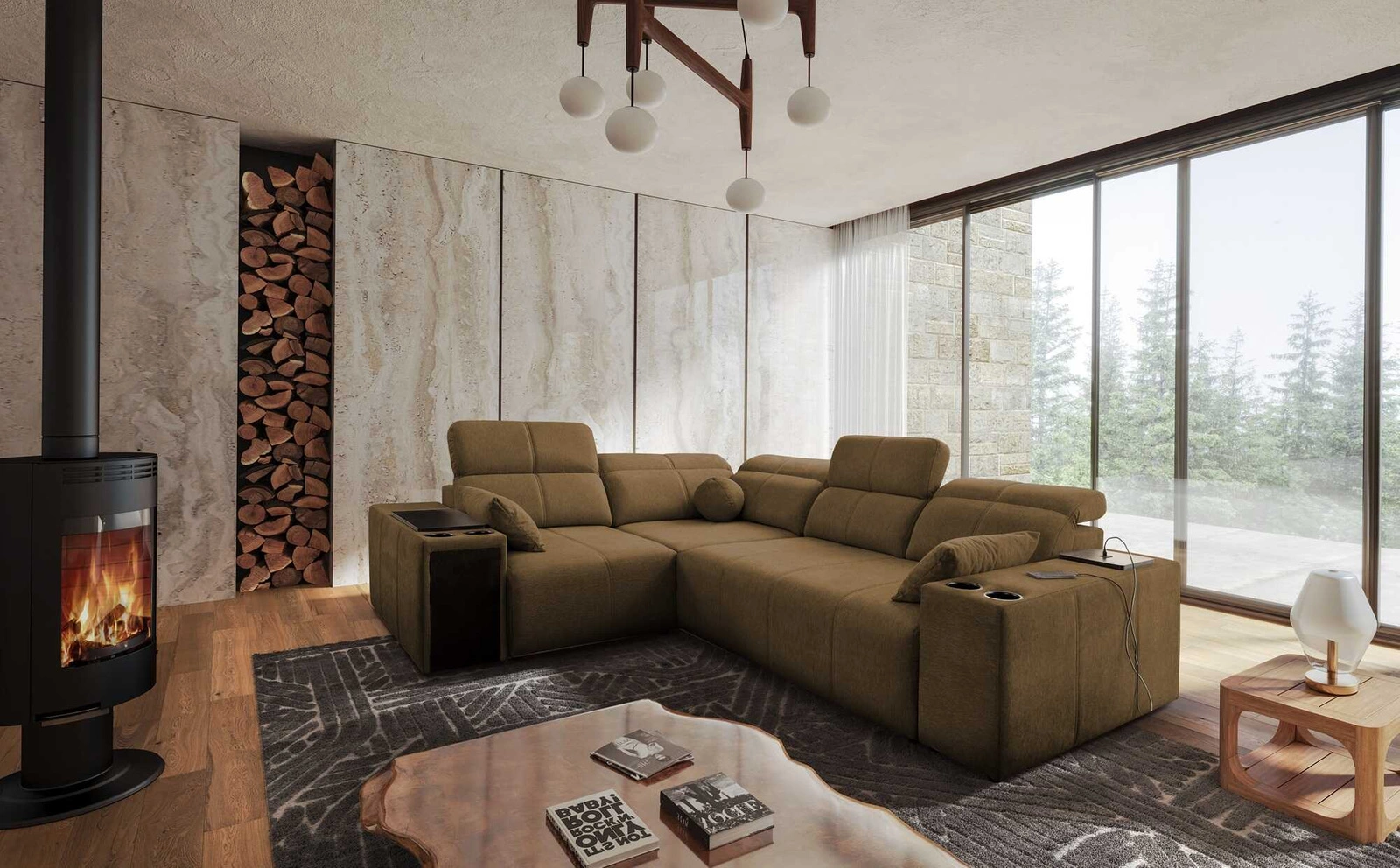 Mezi doplňky tohoto kusu nábytku, které ocení všichni uživatelé, patří nastavitelné opěradlo, které umožňuje nastavit hloubku sedáku, zásuvka a otevírací lišta v boční části rohu, nabíjecí zásuvka USB, držáky na nápoje a nádoba na lůžkoviny.
