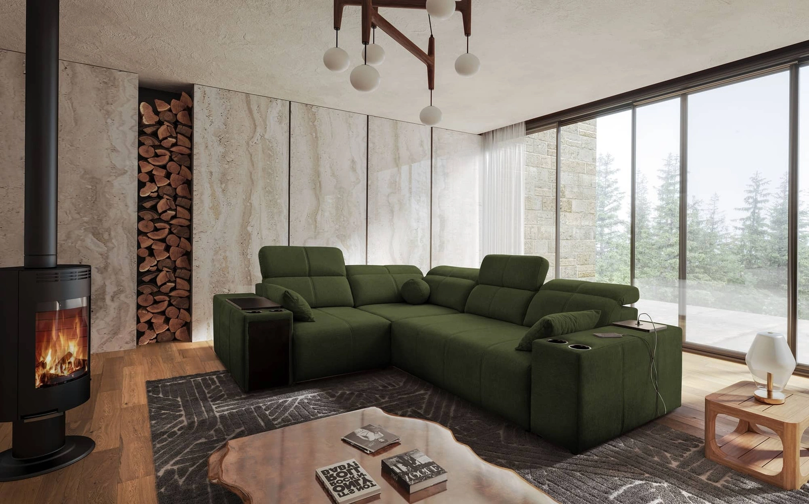 Mezi doplňky tohoto kusu nábytku, které ocení všichni uživatelé, patří nastavitelné opěradlo, které umožňuje nastavit hloubku sedáku, zásuvka a otevírací lišta v boční části rohu, nabíjecí zásuvka USB, držáky na nápoje a nádoba na lůžkoviny.