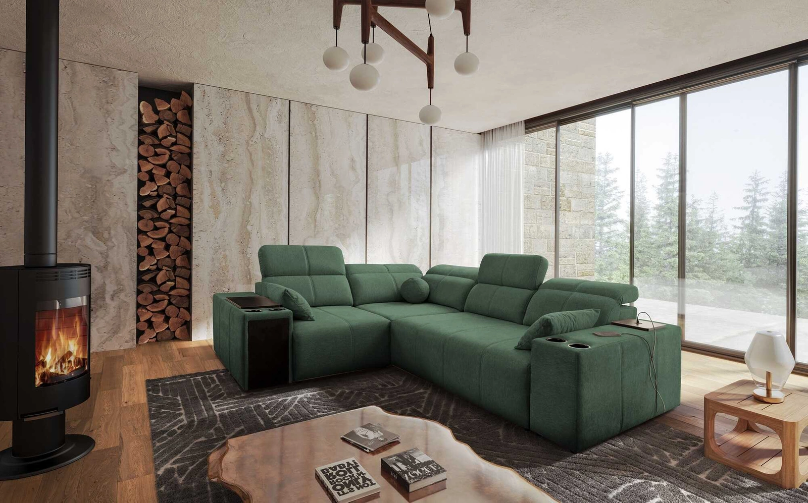 Mezi doplňky tohoto kusu nábytku, které ocení všichni uživatelé, patří nastavitelné opěradlo, které umožňuje nastavit hloubku sedáku, zásuvka a otevírací lišta v boční části rohu, nabíjecí zásuvka USB, držáky na nápoje a nádoba na lůžkoviny.