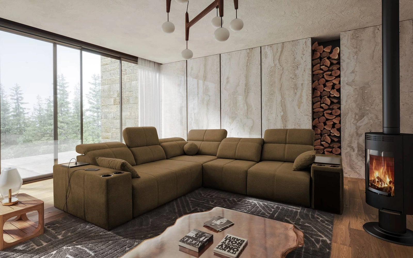 Mezi doplňky tohoto kusu nábytku, které ocení všichni uživatelé, patří nastavitelné opěradlo, které umožňuje nastavit hloubku sedáku, zásuvka a otevírací lišta v boční části rohu, nabíjecí zásuvka USB, držáky na nápoje a dvě nádoby na lůžkoviny.