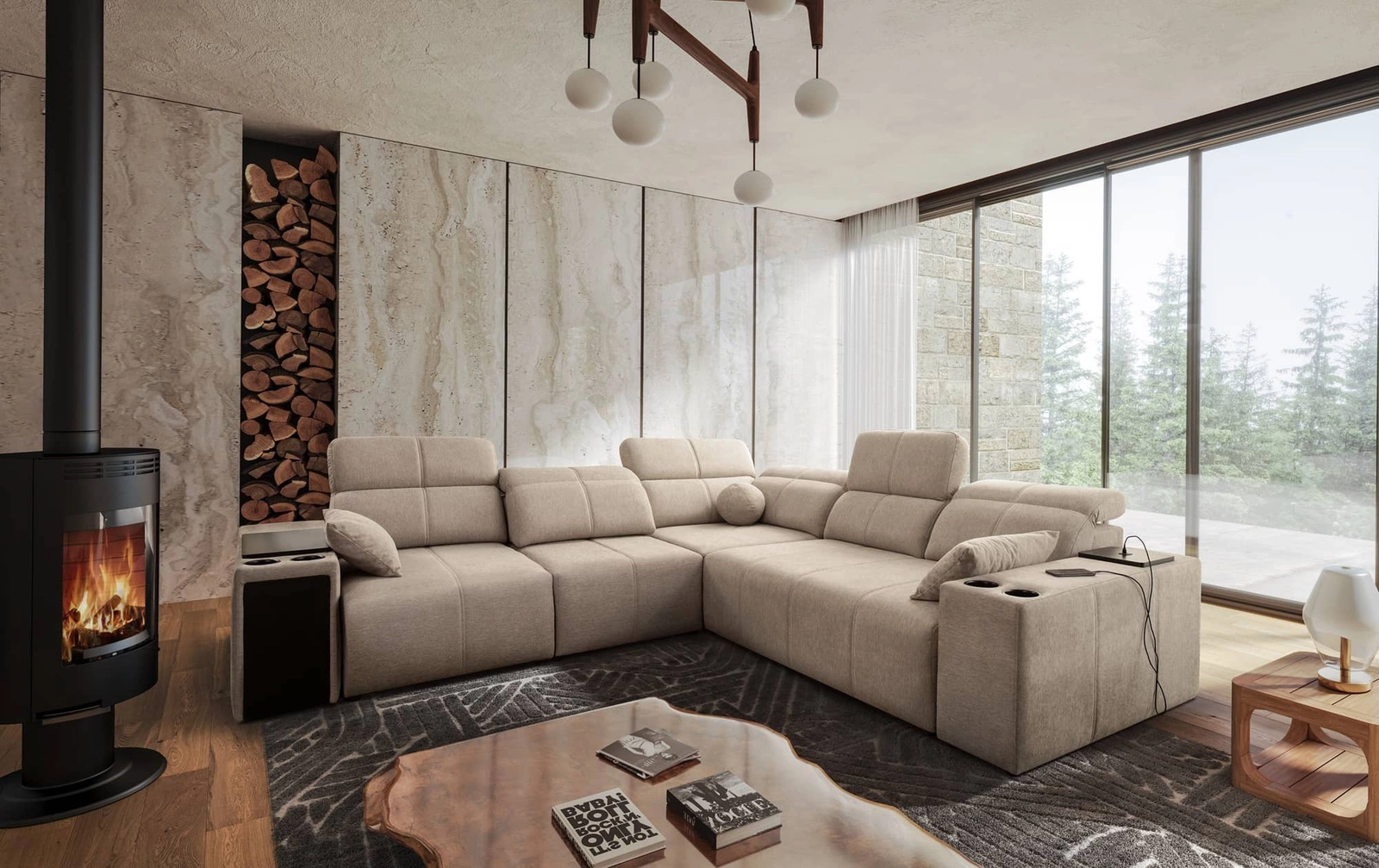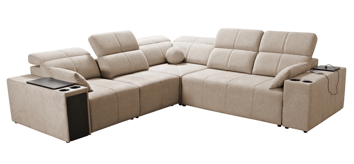 Mezi doplňky tohoto kusu nábytku, které ocení všichni uživatelé, patří nastavitelné opěradlo, které umožňuje nastavit hloubku sedáku, zásuvka a otevírací lišta v boční části rohu, nabíjecí zásuvka USB, držáky na nápoje a dvě nádoby na lůžkoviny.