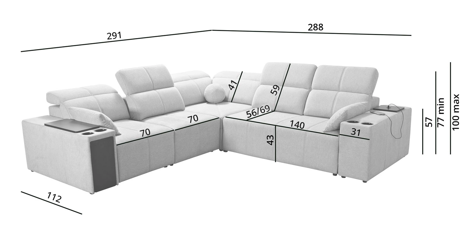 Rozměry nábytku umožňují vyplnění prostoru v prostorném obývacím pokoji nebo zasedací místnosti. Šířka rohu 288 cm, maximální výška 100 cm a hloubka 291 cm. Spací plocha rohové jednotky je 138x212 cm. Výška sedadla nábytku je 43 cm a maximální výška opěradla je 59 cm. Vlnité pružiny a polyuretanová pěna T30 je materiál, z něhož je vyrobeno sedadlo rohu. Zádová opěrka s nastavitelnými opěrkami hlavy vám umožní snadno nastavit úhel opěrek hlavy podle vašich preferencí a zaručí pohodlný odpočinek po dlouhém dni, který oceníte vy, vaši blízcí i hosté, kteří si na tuto jedinečnou rohovou sedačku sednou.