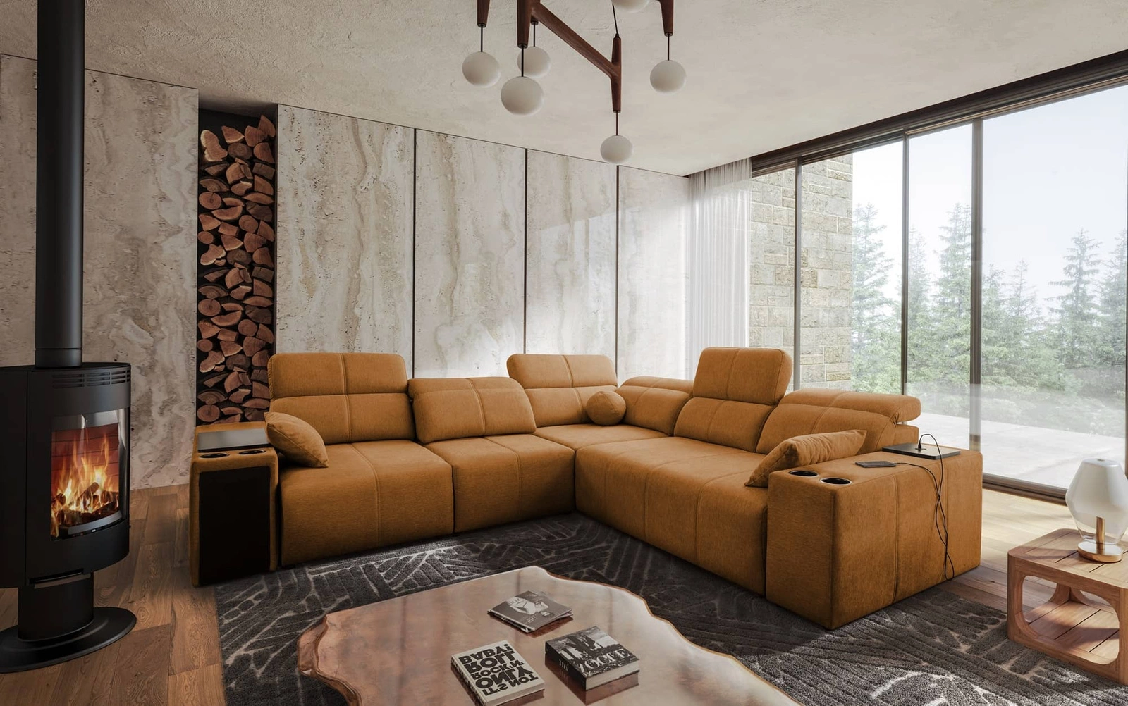 Rohová pohovka Tesalia III v medové barvě je mimořádně funkční kus nábytku se stylovou povrchovou úpravou.