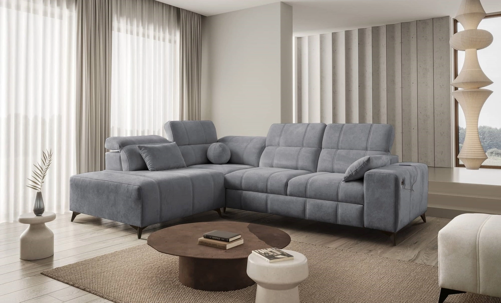 Rohová pohovka Penejos VII v šedé barvě s nastavitelnými opěrkami hlavy je nádherný kus nábytku se zárukou nejvyššího pohodlí a funkčnosti.