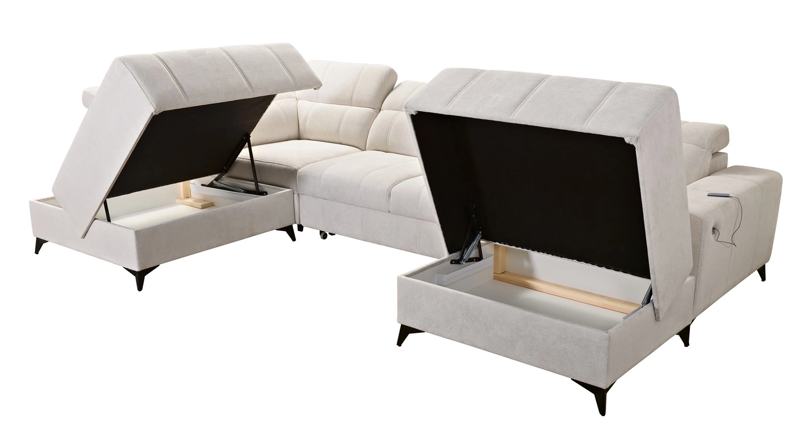 Mezi doplňky tohoto nábytku, které ocení všichni uživatelé, patří dva kontejnery na lůžkoviny, funkce spaní a nabíjecí zásuvka USB na boku rohové skříně.