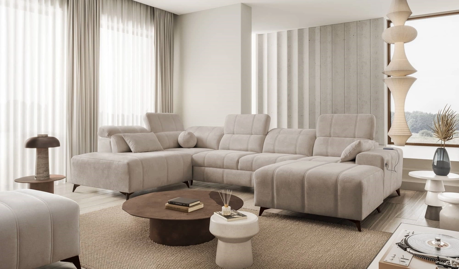 Rohová pohovka Penejos VI v tmavě béžové barvě s nastavitelnými opěrkami hlavy je nádherný kus nábytku se zárukou nejvyššího pohodlí a funkčnosti.