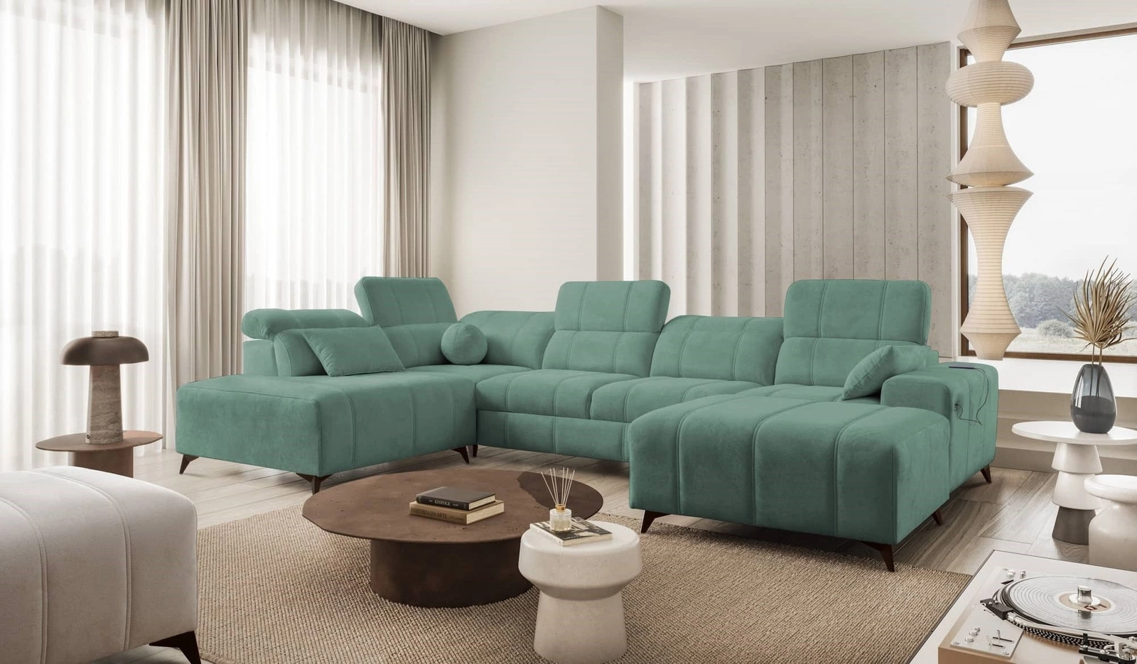 Rohová pohovka Penejos VI v zelené barvě s nastavitelnými opěrkami hlavy je nádherný kus nábytku se zárukou nejvyššího pohodlí a funkčnosti.