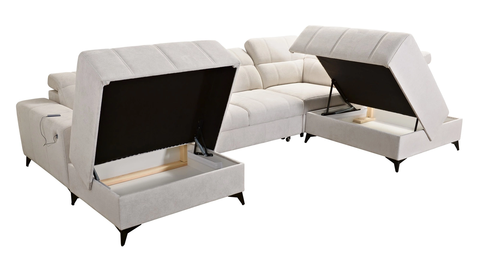 Mezi doplňky tohoto nábytku, které ocení všichni uživatelé, patří dva kontejnery na lůžkoviny, funkce spaní a nabíjecí zásuvka USB na boku rohové skříně.
