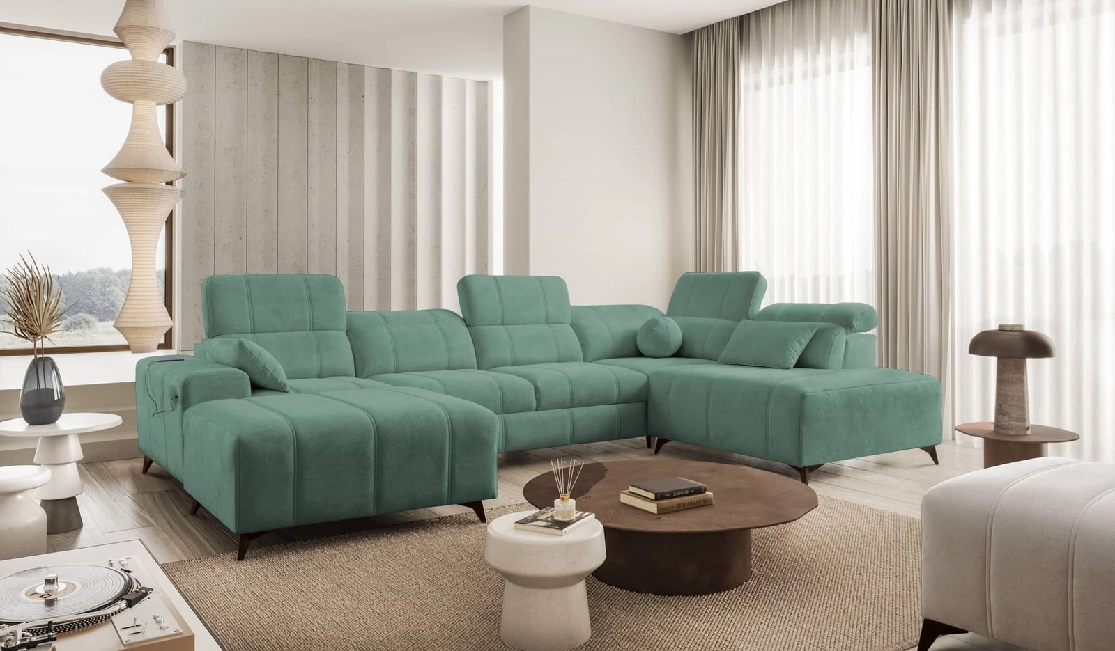 Rohová pohovka Penejos VI v zelené barvě s nastavitelnými opěrkami hlavy je nádherný kus nábytku se zárukou nejvyššího pohodlí a funkčnosti.