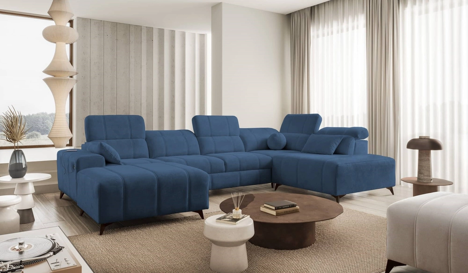 Rohová pohovka Penejos VI v modré barvě s nastavitelnými opěrkami hlavy je nádherný kus nábytku se zárukou nejvyššího pohodlí a funkčnosti.