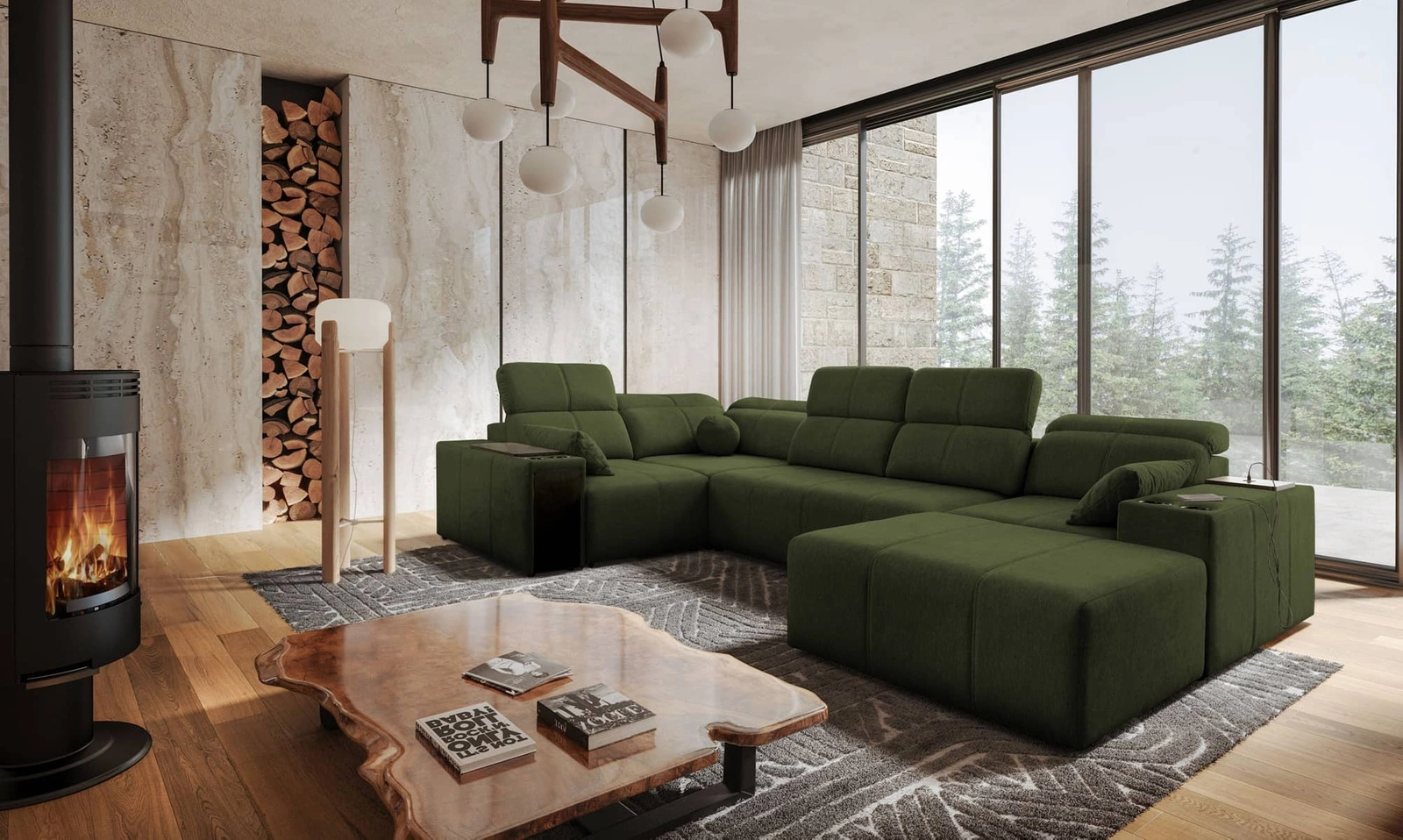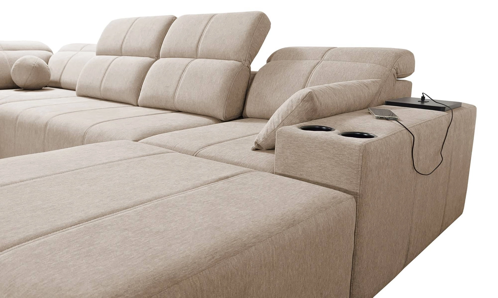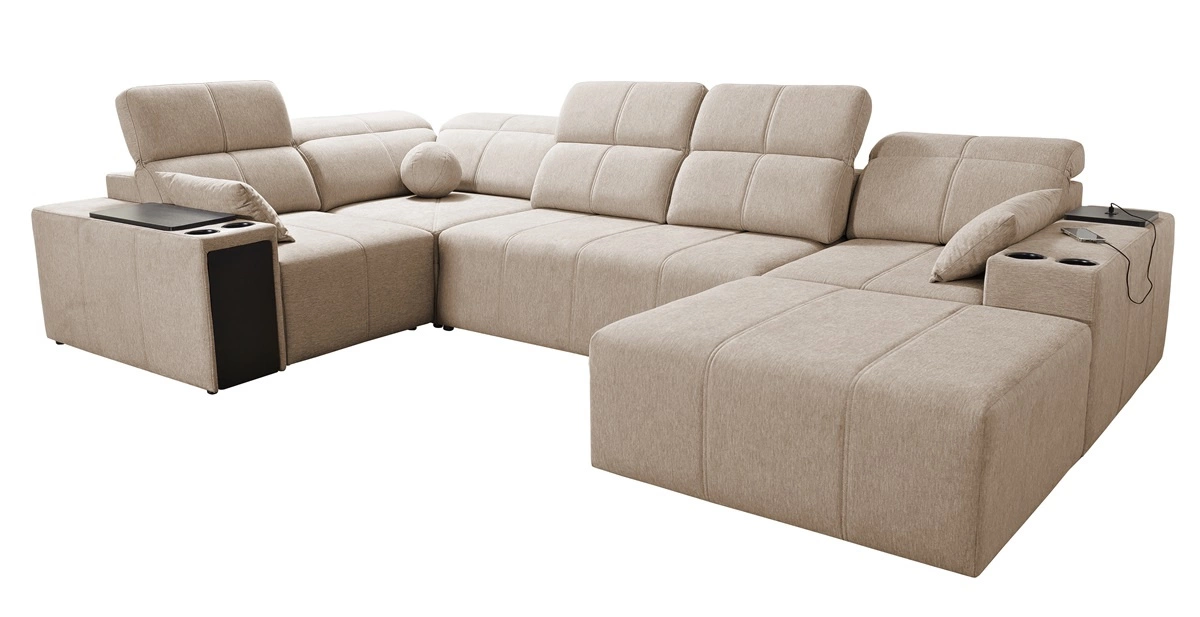 Mezi doplňky tohoto kusu nábytku, které ocení všichni uživatelé, patří nastavitelné opěradlo, které umožňuje nastavit hloubku sedáku, zásuvka a otevírací lišta v boční části rohu, nabíjecí zásuvka USB, držáky na nápoje a dvě nádoby na lůžkoviny.