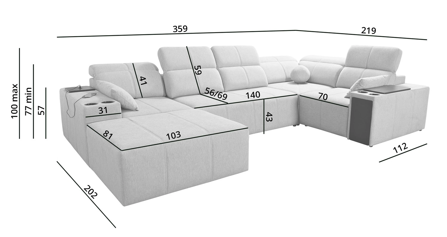 Rozměry nábytku umožňují vyplnění prostoru v prostorném obývacím pokoji nebo zasedací místnosti. Šířka rohu 359 cm, maximální výška 100 cm a hloubka 219 cm. Spací plocha rohové jednotky je 138x284 cm. Výška sedadla nábytku je 43 cm a maximální výška opěradla je 59 cm. Vlnité pružiny a polyuretanová pěna T30 je materiál, z něhož je vyrobeno sedadlo rohu. Zádová opěrka s nastavitelnými opěrkami hlavy vám umožní snadno nastavit úhel opěrek hlavy podle vašich preferencí a zaručí pohodlný odpočinek po dlouhém dni, který oceníte vy, vaši blízcí i hosté, kteří si na tuto jedinečnou rohovou sedačku sednou.