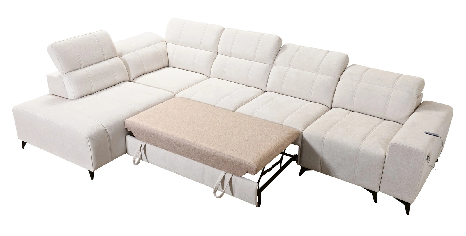 Mezi doplňky tohoto nábytku, které ocení všichni uživatelé, patří dva kontejnery na lůžkoviny, funkce spaní a nabíjecí zásuvka USB na boku rohové skříně.