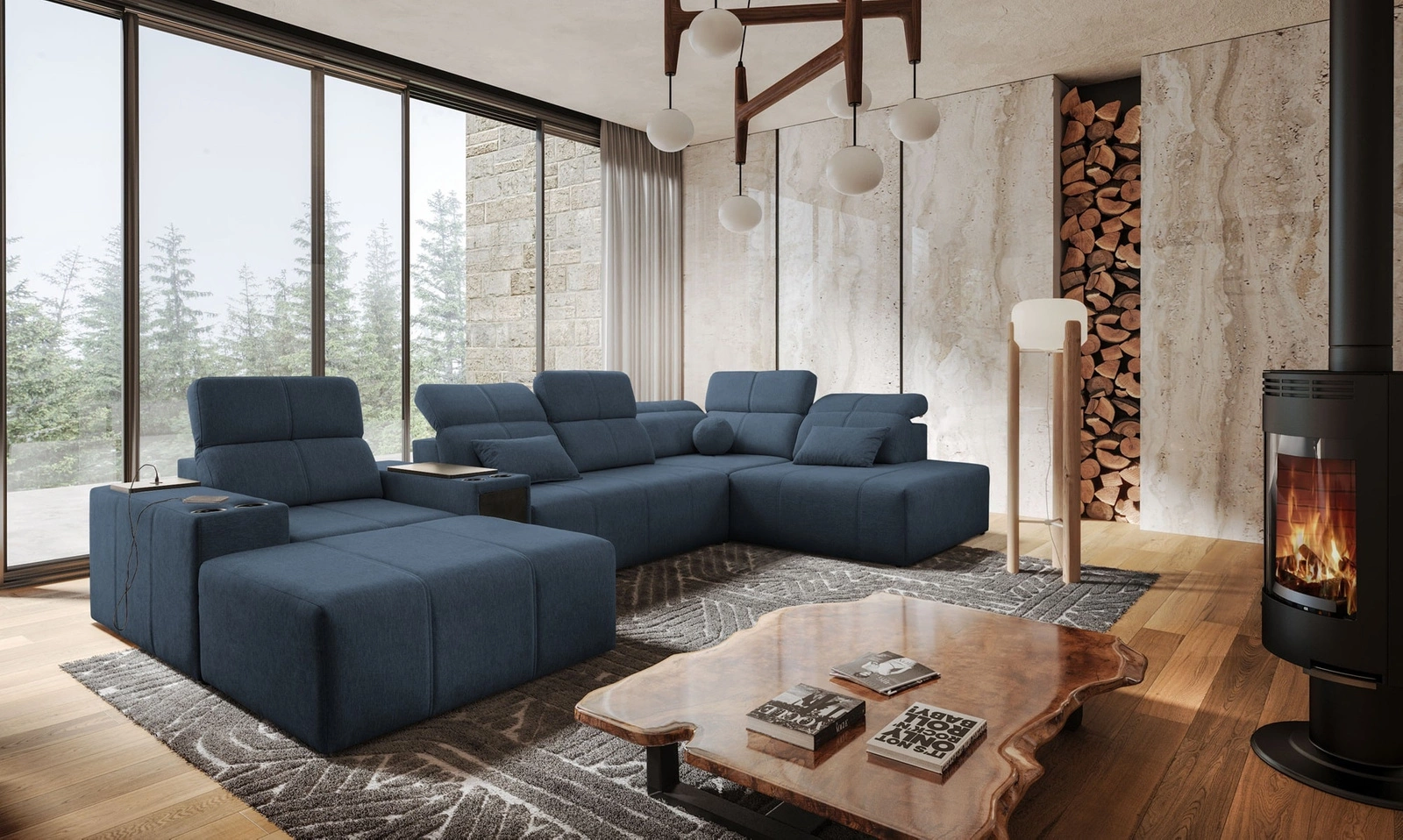 Rohová pohovka Thessaly V v modré barvě je vysoce funkční kus nábytku se stylovou povrchovou úpravou.