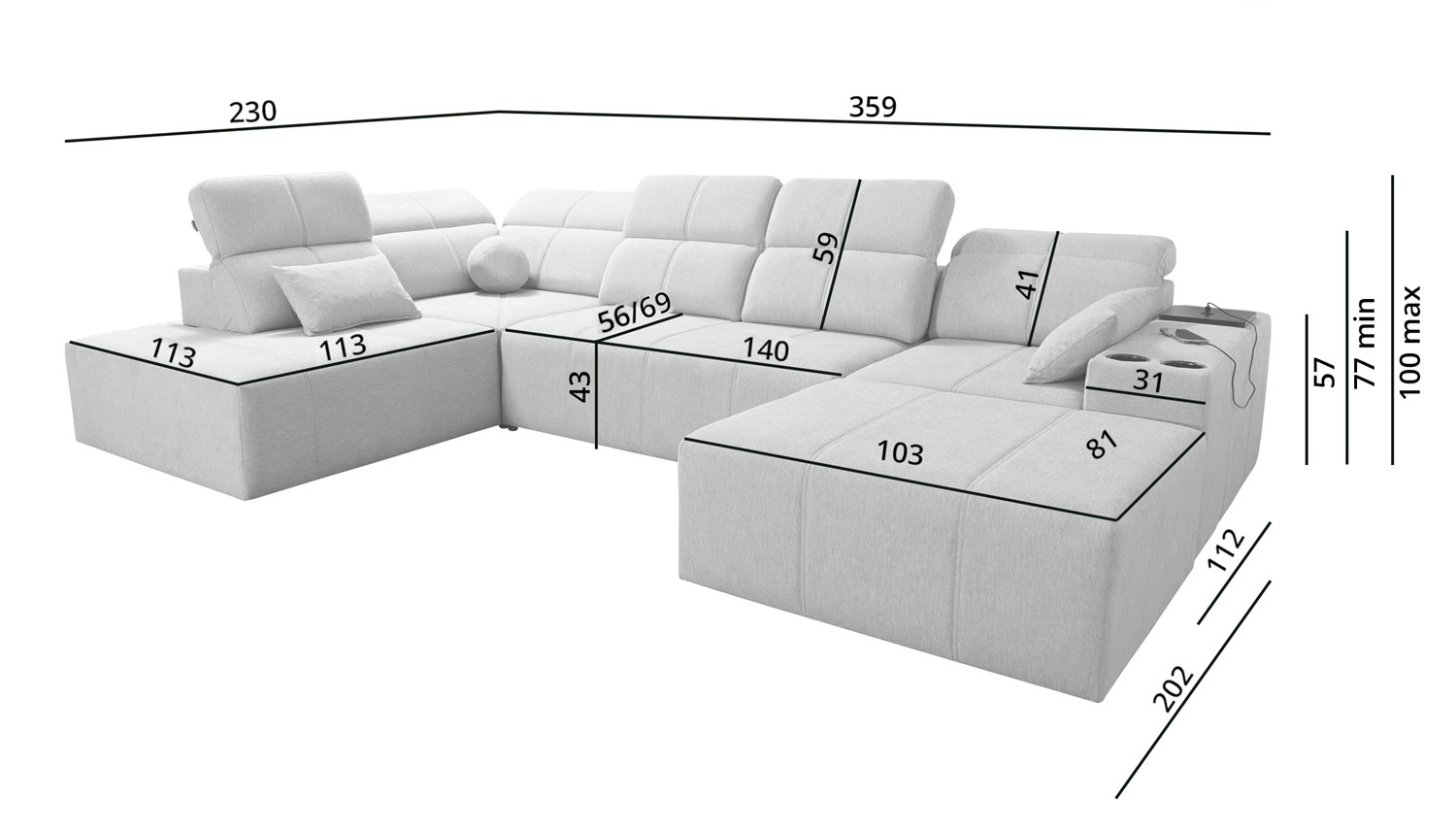 Rozměry nábytku umožňují vyplnění prostoru v prostorném obývacím pokoji nebo zasedací místnosti. Šířka rohu 359 cm, maximální výška 100 cm a hloubka 230 cm. Spací plocha rohové jednotky je 138x284 cm. Výška sedadla nábytku je 43 cm a maximální výška opěradla je 59 cm. Vlnité pružiny a polyuretanová pěna T30 je materiál, z něhož je vyrobeno sedadlo rohu. Zádová opěrka s nastavitelnými opěrkami hlavy vám umožní snadno nastavit úhel opěrek hlavy podle vašich preferencí a zaručí pohodlný odpočinek po dlouhém dni, který oceníte vy, vaši blízcí i hosté, kteří si na tuto jedinečnou rohovou sedačku sednou.