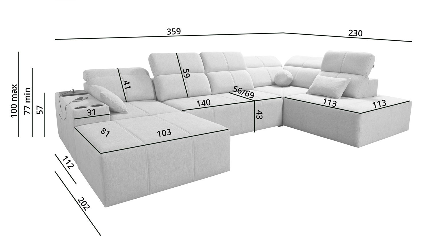 Rozměry nábytku umožňují vyplnění prostoru v prostorném obývacím pokoji nebo zasedací místnosti. Šířka rohu 359 cm, maximální výška 100 cm a hloubka 230 cm. Spací plocha rohové jednotky je 138x284 cm. Výška sedadla nábytku je 43 cm a maximální výška opěradla je 59 cm. Vlnité pružiny a polyuretanová pěna T30 je materiál, z něhož je vyrobeno sedadlo rohu. Zádová opěrka s nastavitelnými opěrkami hlavy vám umožní snadno nastavit úhel opěrek hlavy podle vašich preferencí a zaručí pohodlný odpočinek po dlouhém dni, který oceníte vy, vaši blízcí i hosté, kteří si na tuto jedinečnou rohovou sedačku sednou.