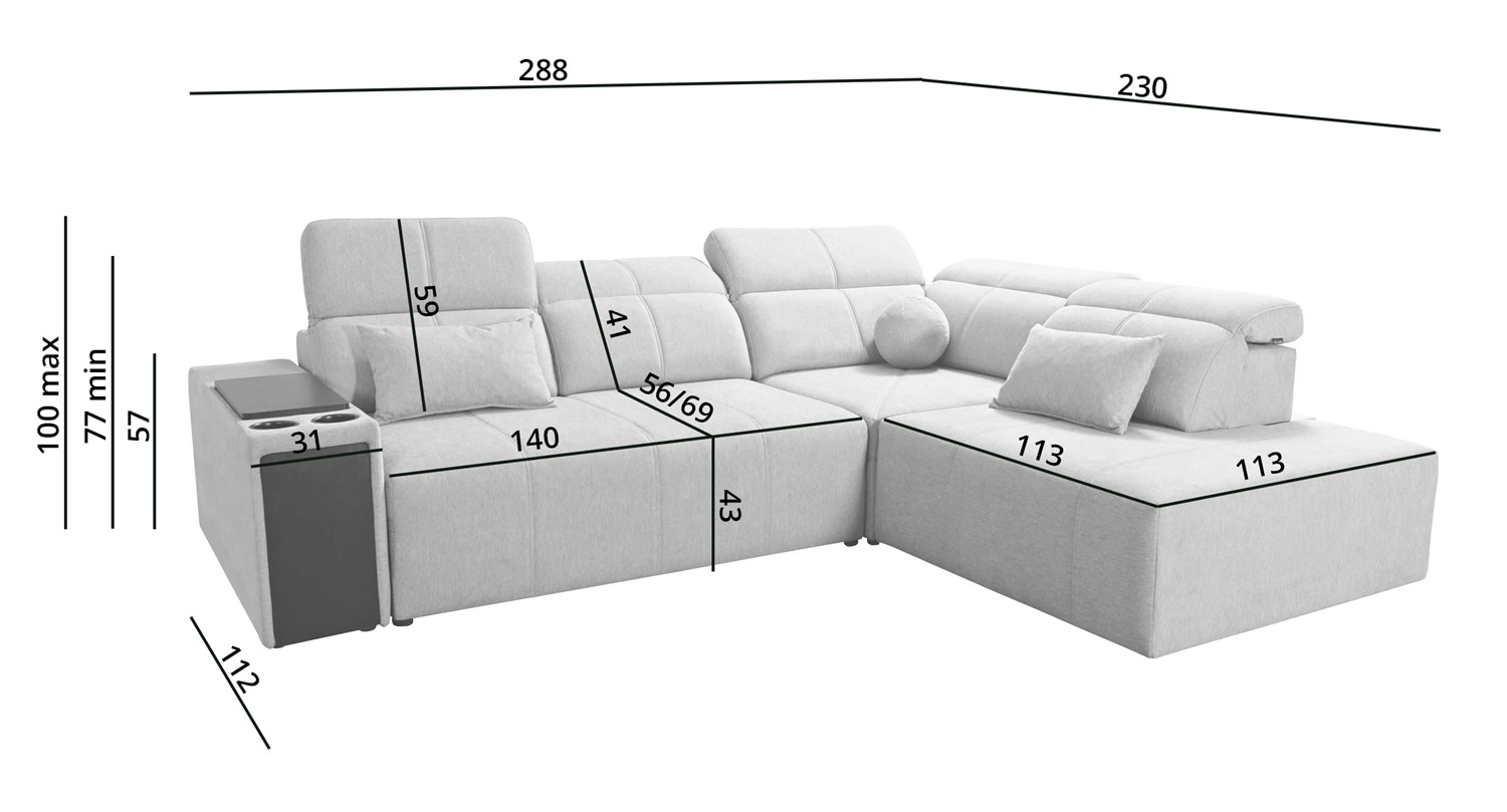 Rozměry nábytku umožňují vyplnění prostoru v prostorném obývacím pokoji nebo zasedací místnosti. Šířka rohu 288 cm, maximální výška 100 cm a hloubka 230 cm. Spací plocha rohové jednotky je 138x212 cm. Výška sedadla nábytku je 43 cm a maximální výška opěradla je 59 cm. Vlnité pružiny a polyuretanová pěna T30 je materiál, z něhož je vyrobeno sedadlo rohu. Zádová opěrka s nastavitelnými opěrkami hlavy vám umožní snadno nastavit úhel opěrek hlavy podle vašich preferencí a zaručí pohodlný odpočinek po dlouhém dni, který oceníte vy, vaši blízcí i hosté, kteří si na tuto jedinečnou rohovou sedačku sednou.