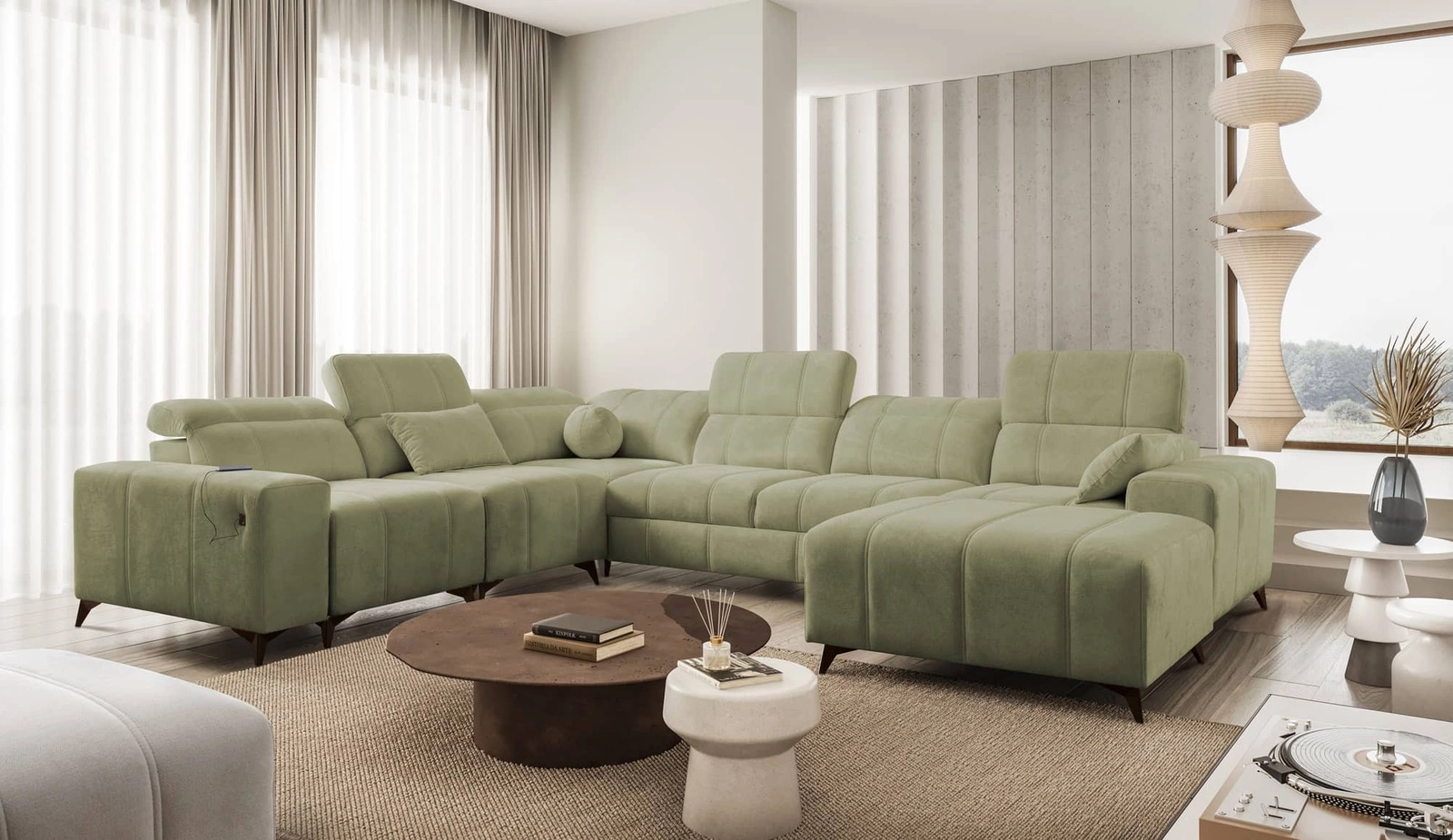 Rohová pohovka Penejos VIII v olivově zelené barvě s nastavitelnými opěrkami hlavy je nádherný kus nábytku se zárukou nejvyššího pohodlí a funkčnosti.