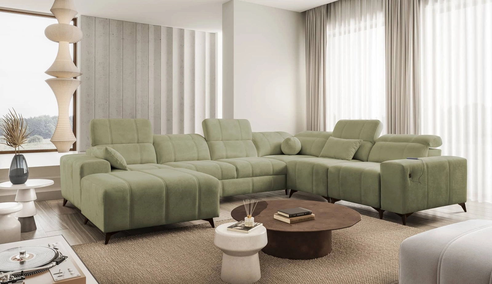 Rohová pohovka Penejos VIII v olivově zelené barvě s nastavitelnými opěrkami hlavy je nádherný kus nábytku se zárukou nejvyššího pohodlí a funkčnosti.