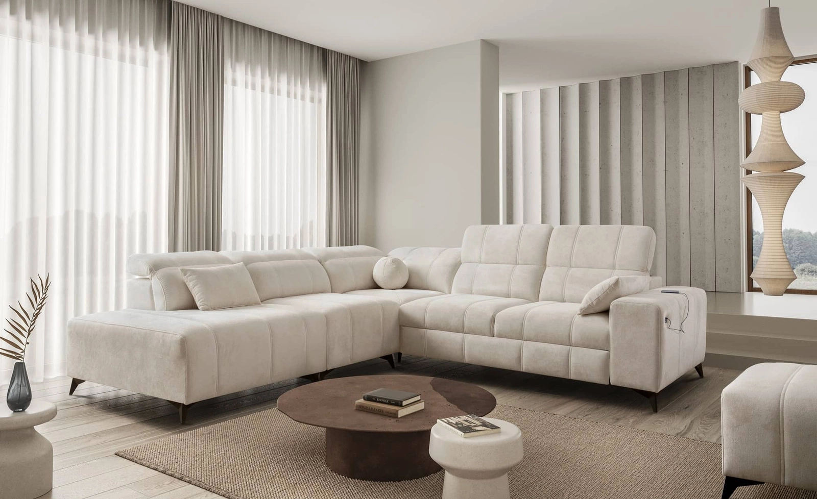 Rohová pohovka Penejos IX v krémové barvě s nastavitelnými opěrkami hlavy je nádherný kus nábytku se zárukou nejvyššího pohodlí a funkčnosti.