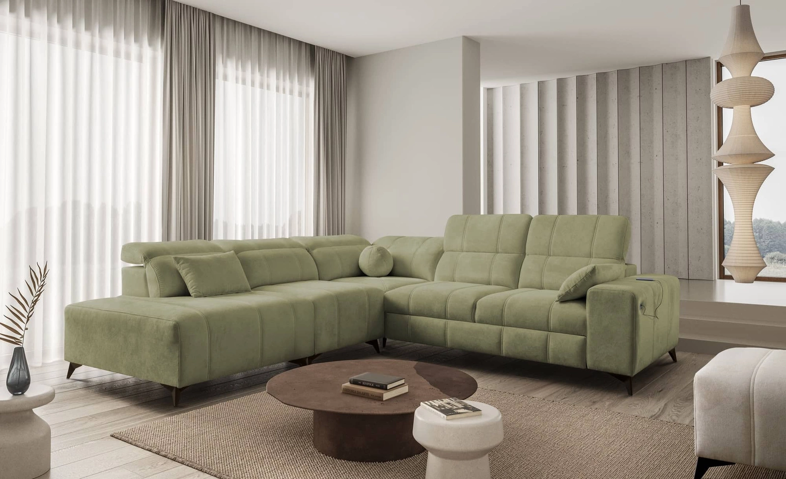 Rohová pohovka Penejos IX v olivově zelené barvě s nastavitelnými opěrkami hlavy je nádherný kus nábytku se zárukou nejvyššího pohodlí a funkčnosti.