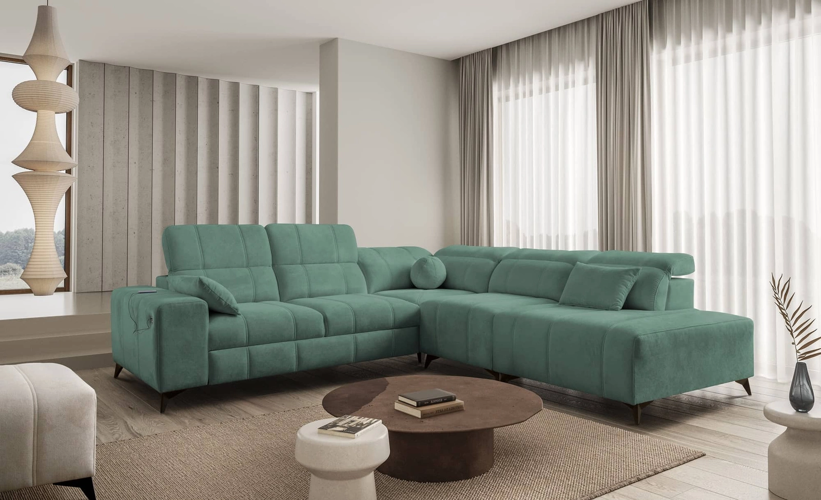 Rohová pohovka Penejos IX v zelené barvě s nastavitelnými opěrkami hlavy je nádherný kus nábytku se zárukou nejvyššího pohodlí a funkčnosti.