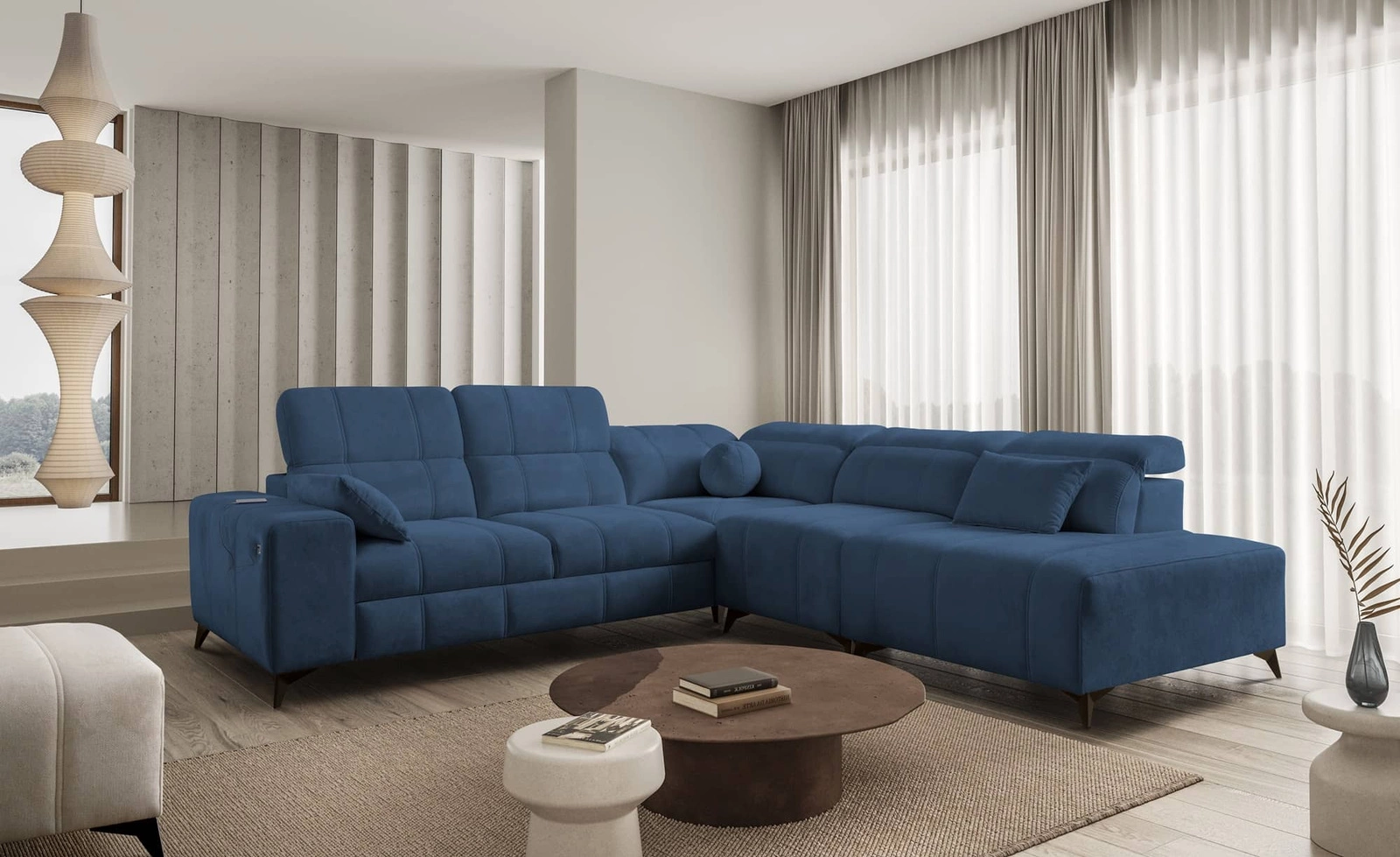 Rohová pohovka Penejos IX v modré barvě s nastavitelnými opěrkami hlavy je nádherný kus nábytku se zárukou nejvyššího pohodlí a funkčnosti.