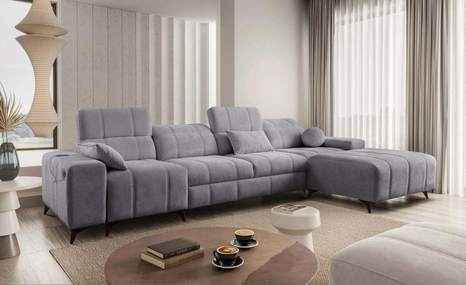 Rohová pohovka Penejos XII ve světle šedé barvě s nastavitelnými opěrkami hlavy je nádherný kus nábytku se zárukou nejvyššího pohodlí a funkčnosti.