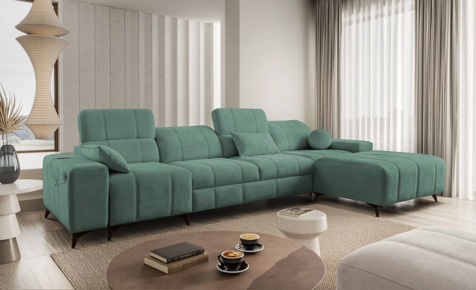 Rohová pohovka Penejos XII v zelené barvě s nastavitelnými opěrkami hlavy je nádherný kus nábytku se zárukou nejvyššího pohodlí a funkčnosti.