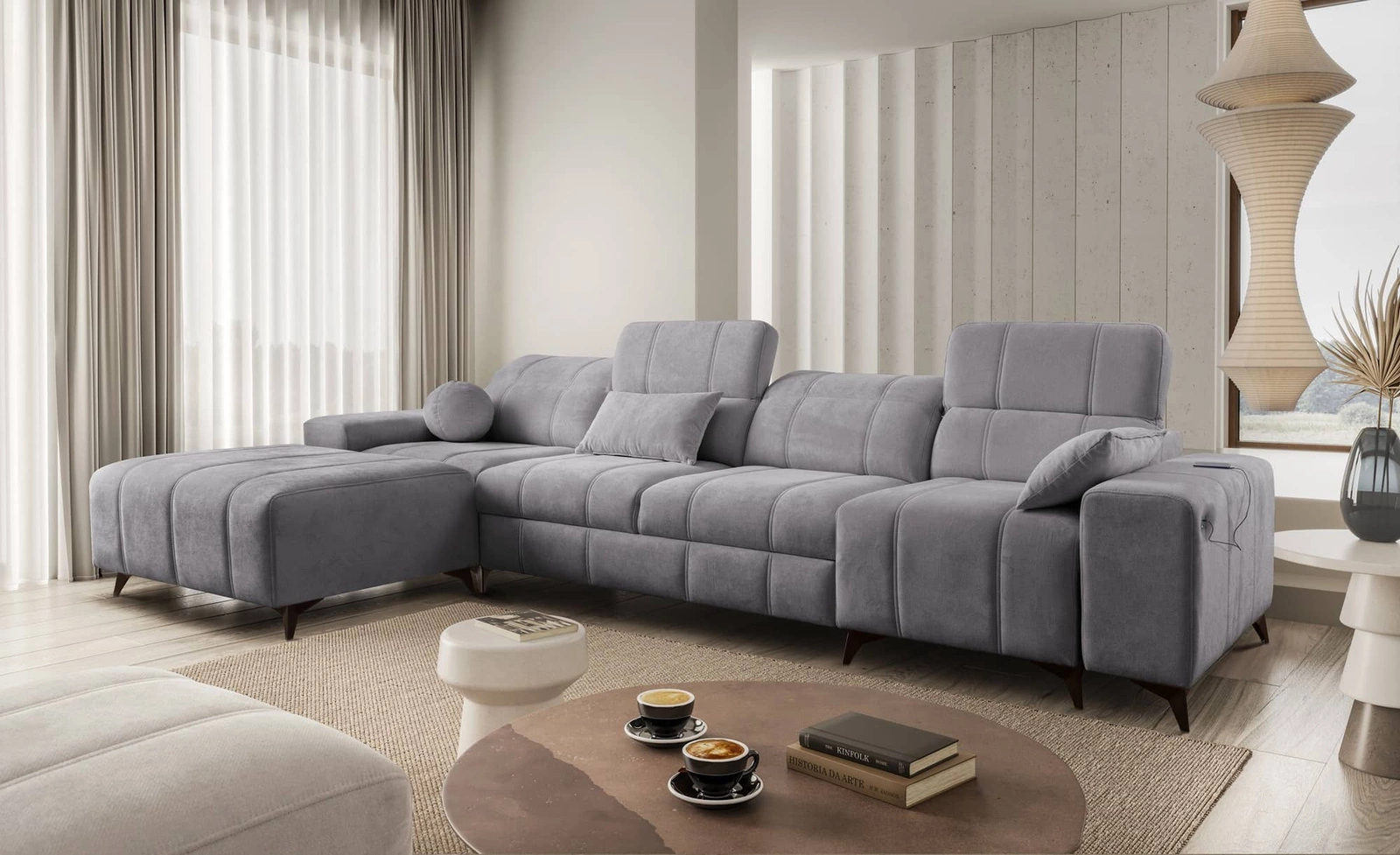 Rohová pohovka Penejos XII ve světle šedé barvě s nastavitelnými opěrkami hlavy je nádherný kus nábytku se zárukou nejvyššího pohodlí a funkčnosti.