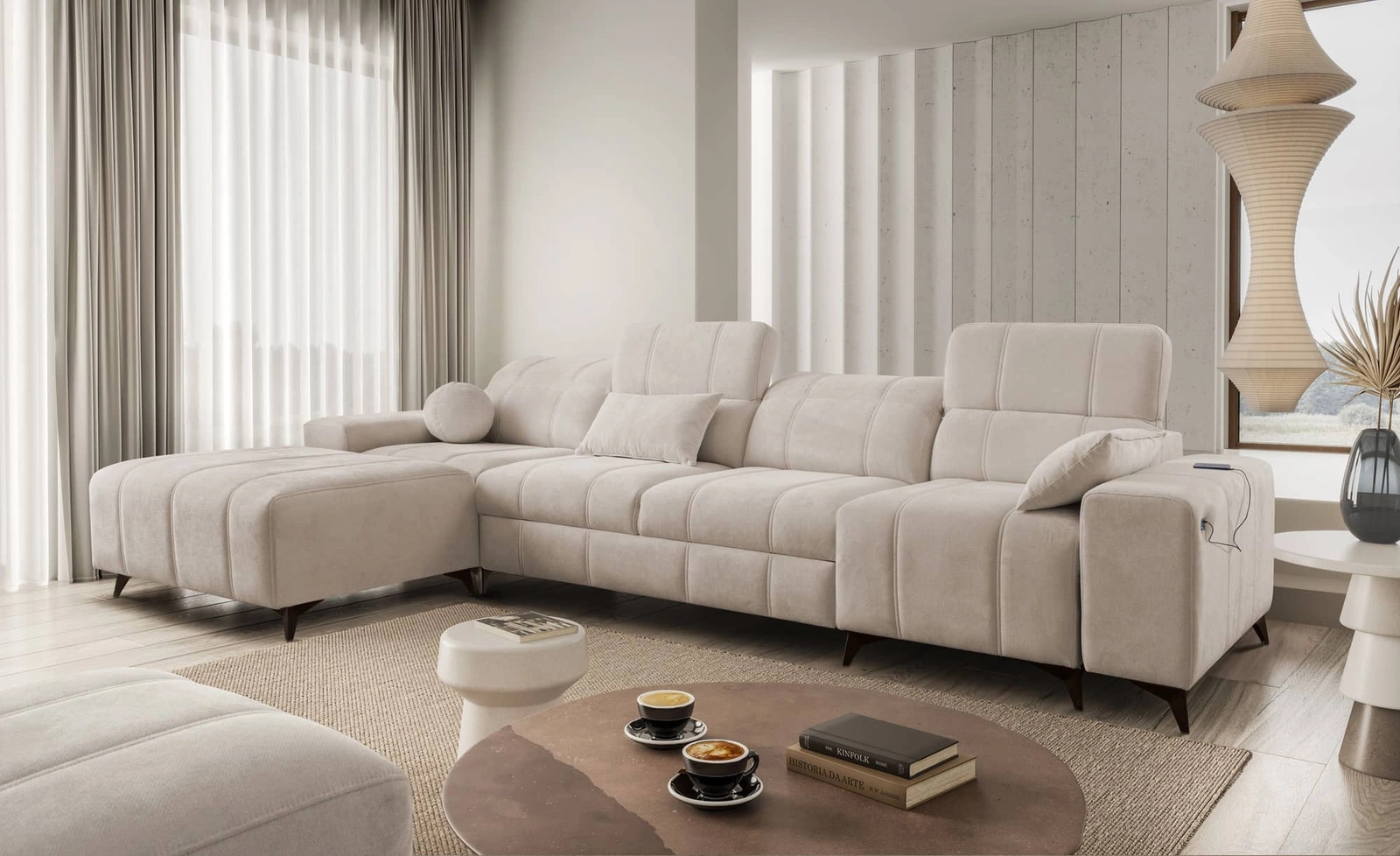 Rohová pohovka Penejos XII v béžové barvě s nastavitelnými opěrkami hlavy je nádherný kus nábytku se zárukou nejvyššího pohodlí a funkčnosti.