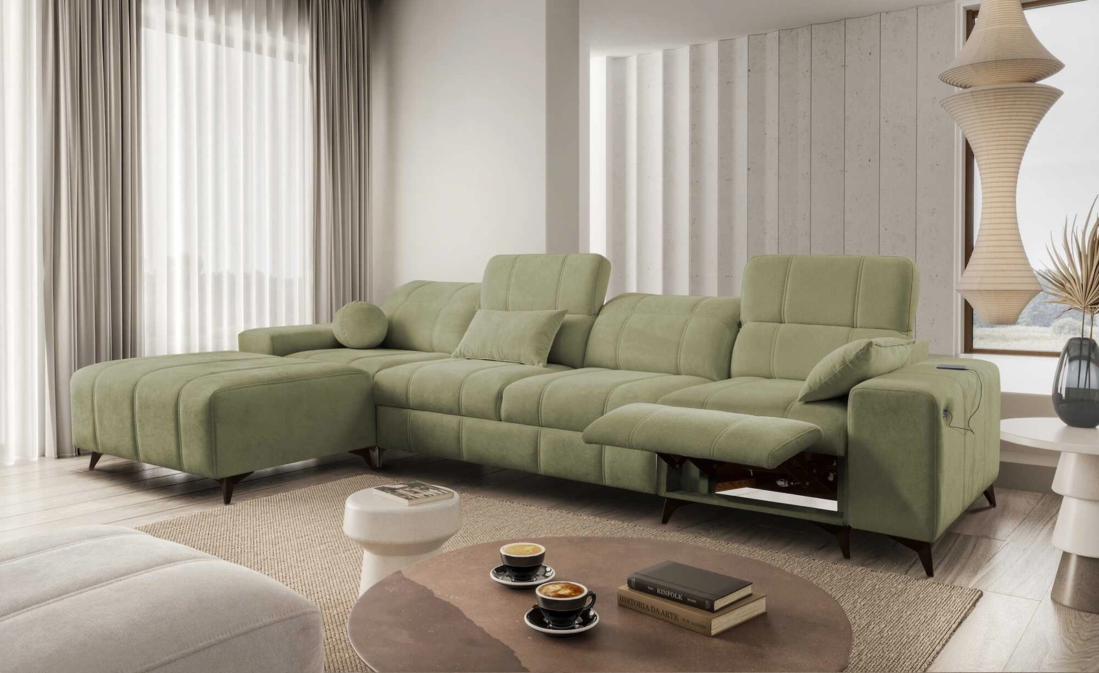 Penejos XII Lux olivová olivová levá rohová pohovka s funkcí spaní Stylová rozkládací pohovka s pohodlnou výsuvnou opěrkou nohou