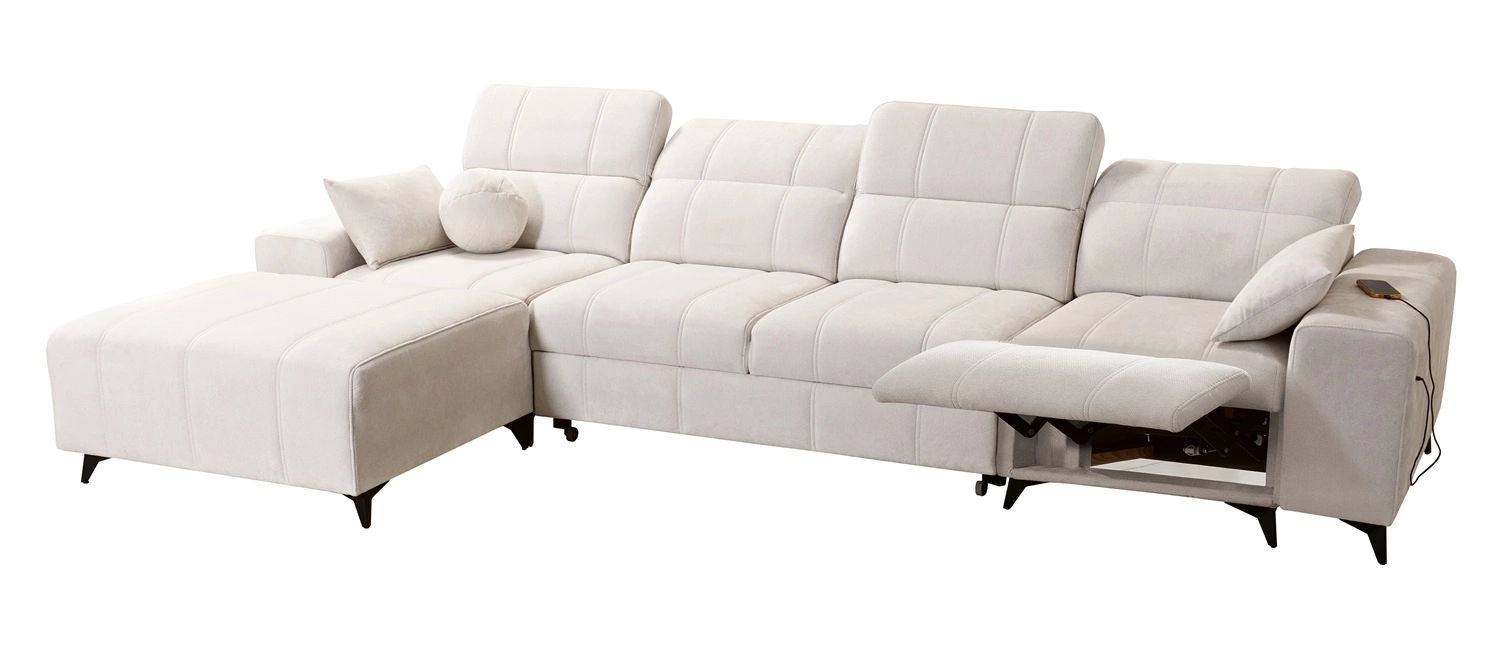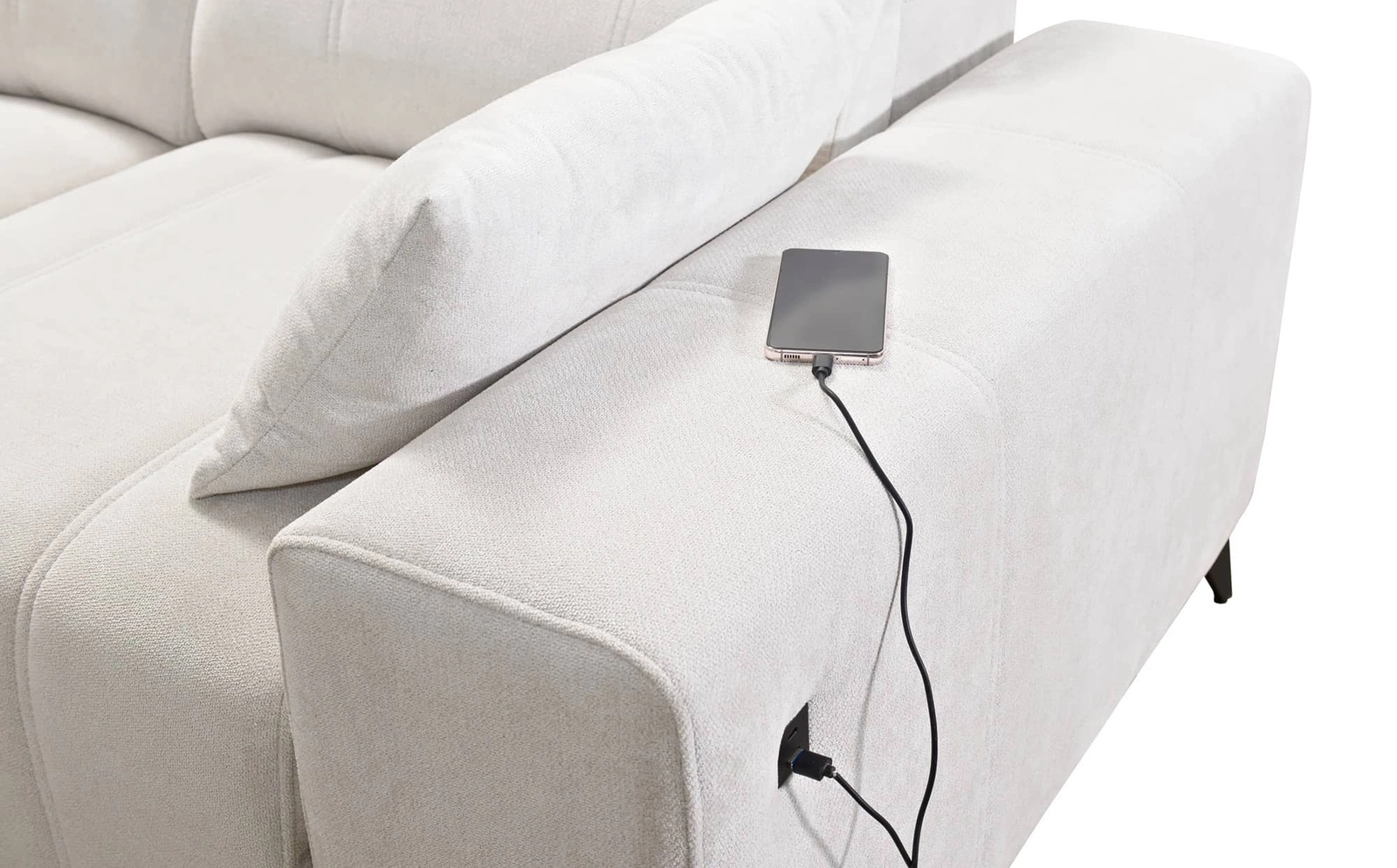 Mezi doplňky tohoto nábytku, které ocení všichni uživatelé, patří výsuvná podnožka, nádoba na lůžkoviny, funkce spaní a nabíjecí zásuvka USB na boku rohové skříně.