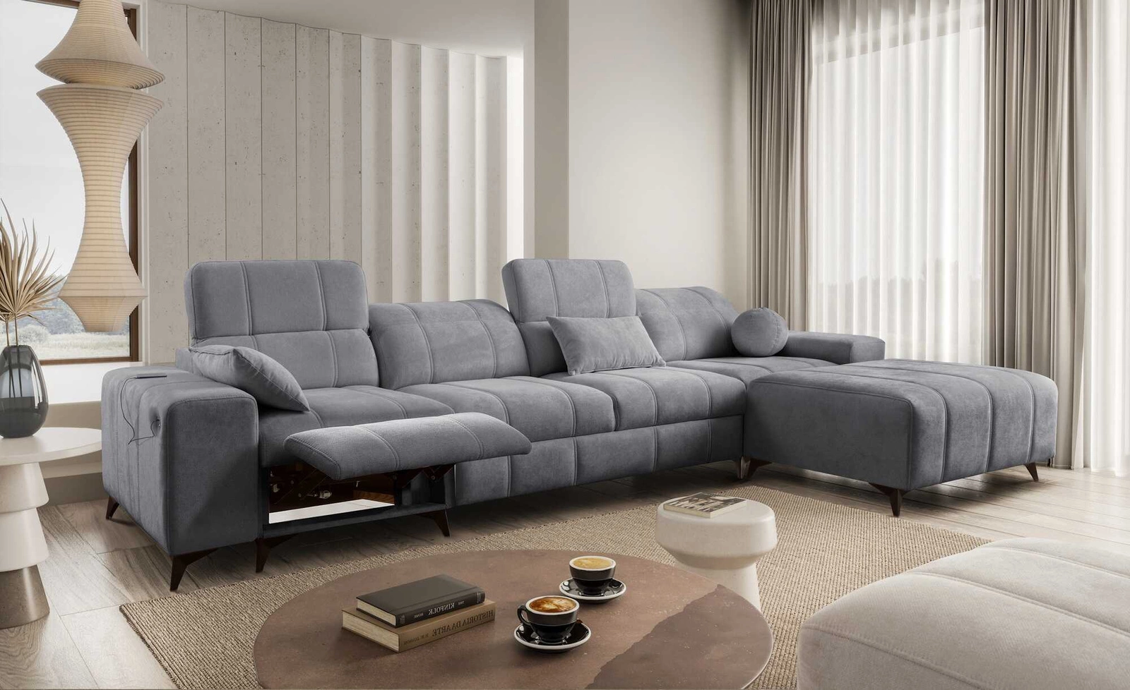 Penejos XII Lux šedá pravá rohová pohovka s funkcí spaní Stylová rozkládací pohovka s pohodlnou výsuvnou opěrkou nohou