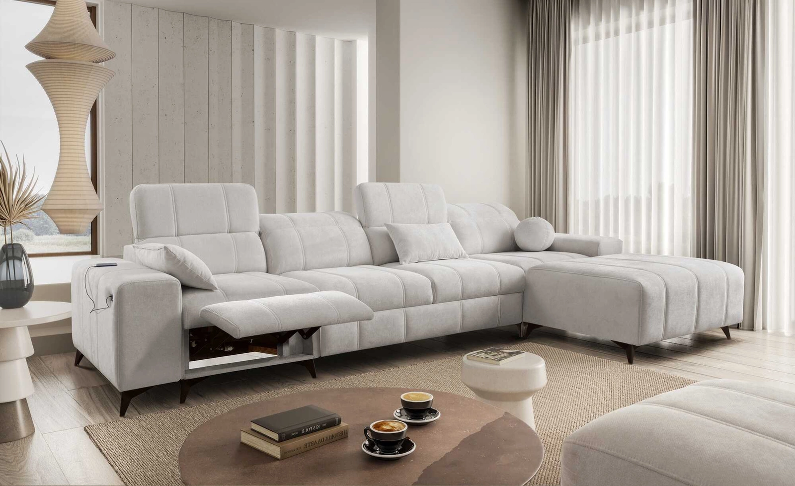 Mezi doplňky tohoto nábytku, které ocení všichni uživatelé, patří výsuvná podnožka, nádoba na lůžkoviny, funkce spaní a nabíjecí zásuvka USB na boku rohové skříně.
