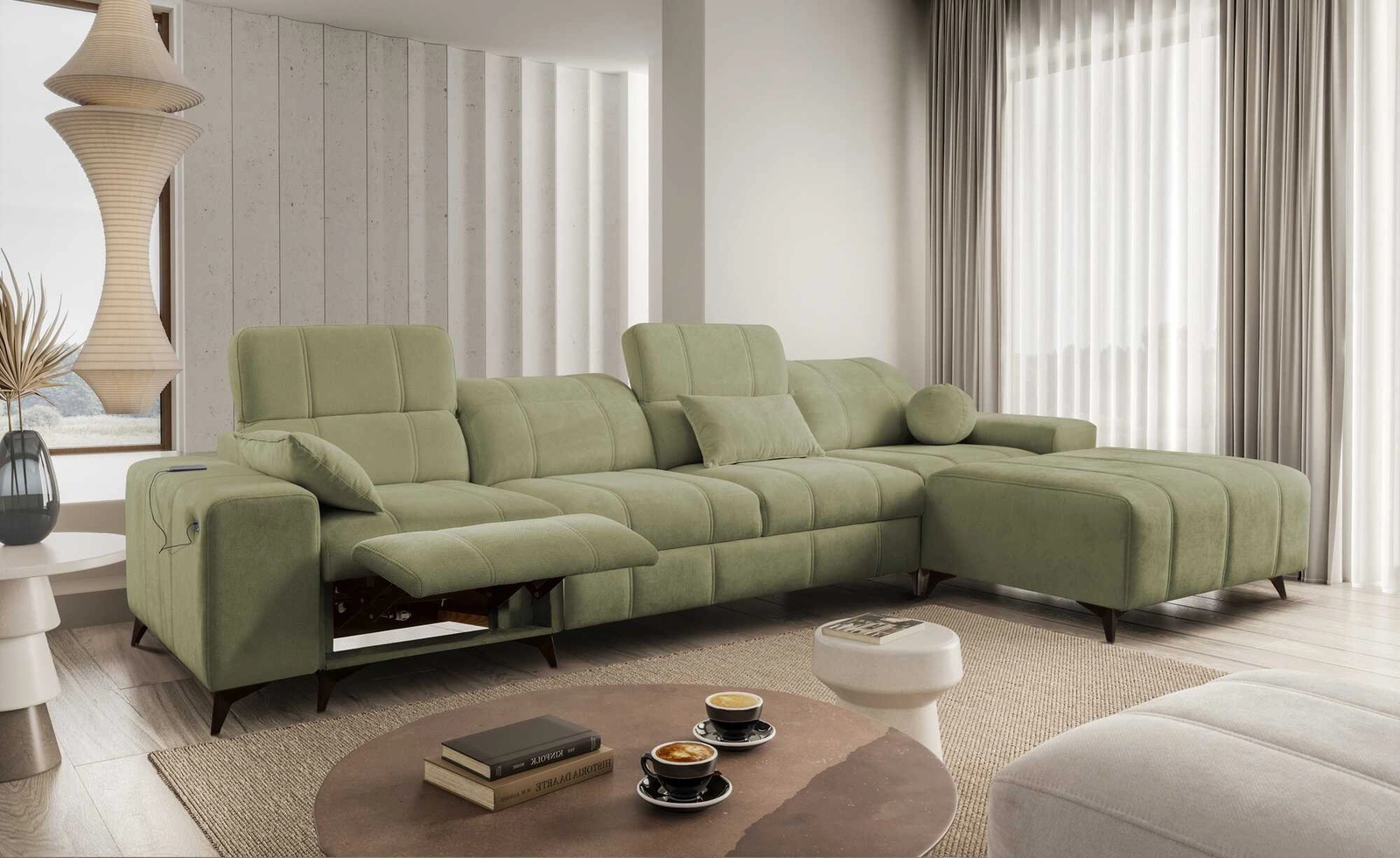 Rohová pohovka Penejos XII Lux v olivově zelené barvě s výsuvnou opěrkou nohou je mimořádně pohodlný kus nábytku se zajímavou povrchovou úpravou.