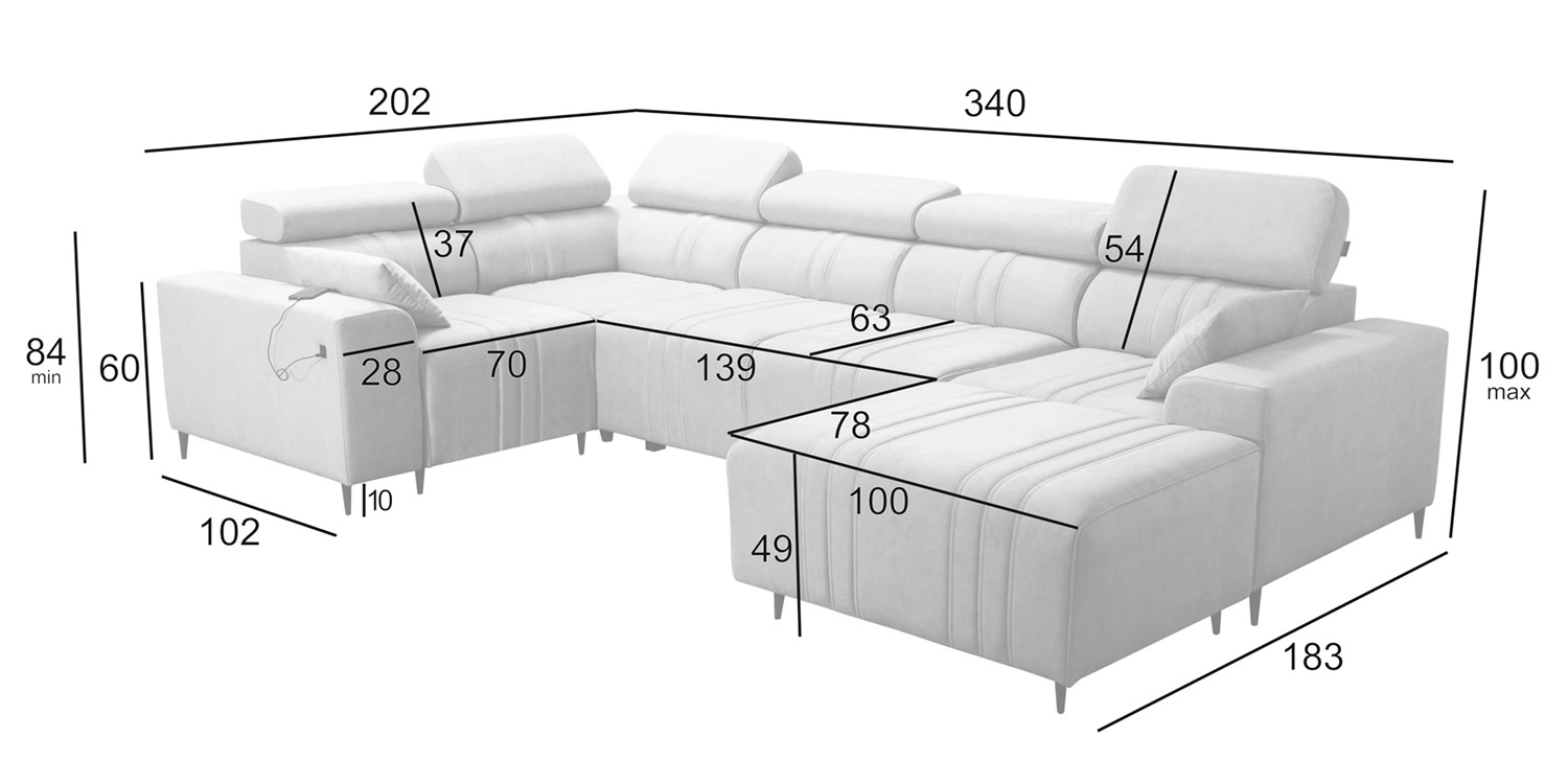 Rozměry nábytku umožňují vyplnění prostoru v prostorném obývacím pokoji nebo zasedací místnosti. Šířka rohu 340 cm, maximální výška 100 cm a hloubka 202 cm. Spací plocha rohové jednotky je 132x268 cm. Výška sedadla nábytku je 49 cm a maximální výška opěradla je 54 cm. Vlnité pružiny a polyuretanová pěna T30 je materiál, z něhož je vyrobeno sedadlo rohu. Pevné opěradlo s nastavitelnými opěrkami hlavy umožní snadné adaptace úhel opěrek hlavy podle vašich preferencí a zaručí vám pohodlný odpočinek po dlouhém dni, který oceníte vy, vaši blízcí i hosté, kteří si na tuto jedinečnou rohovou pohovku sednou.