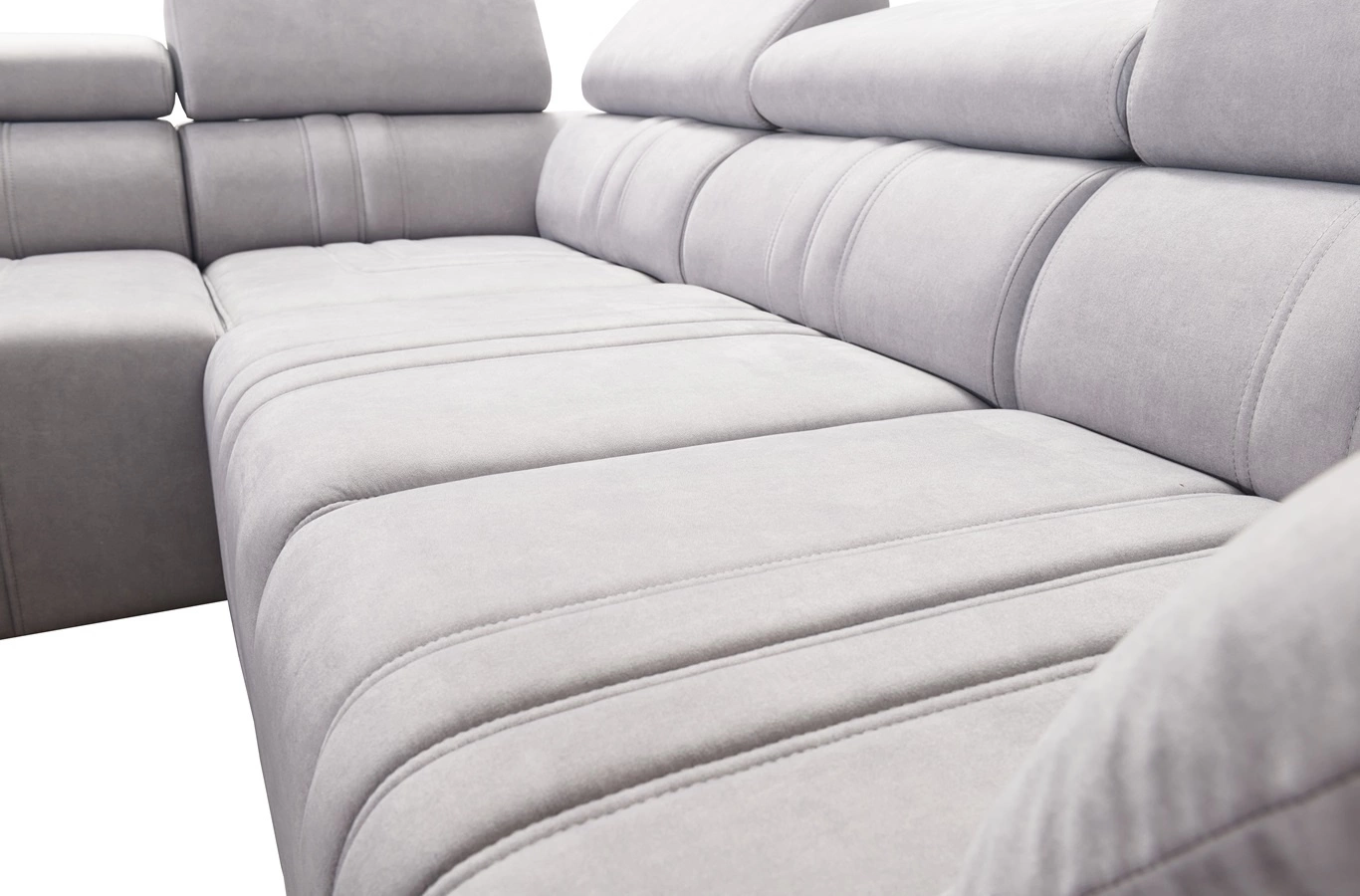 Rohová pohovka Castel IV v šedohnědé barvě s nastavitelnými opěrkami hlavy je mimořádně elegantní kus nábytku se zajímavou povrchovou úpravou.
