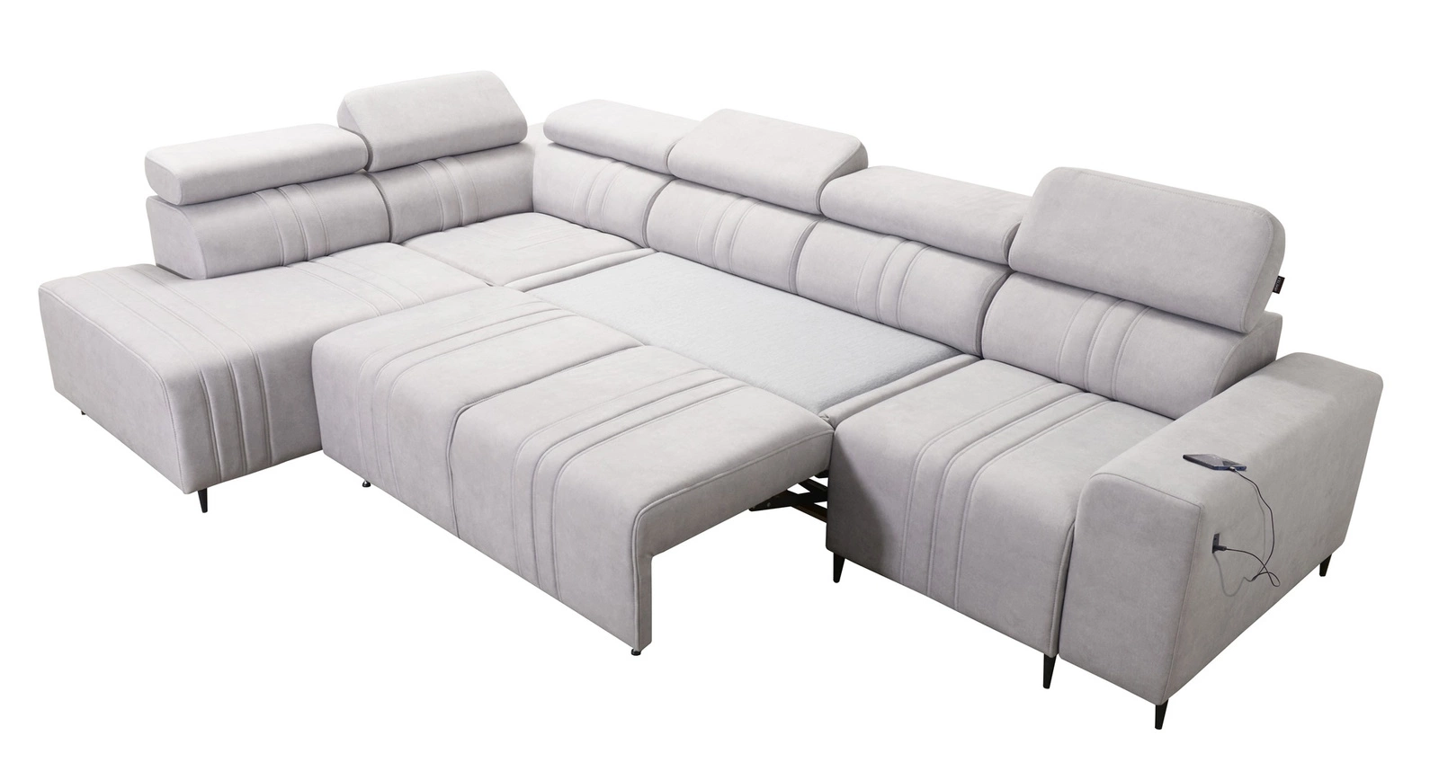Mezi doplňky tohoto nábytku, které ocení všichni uživatelé, patří kontejner na lůžkoviny, nastavitelné opěrky hlavy a nabíjecí zásuvka USB v boční části rohové skříně.