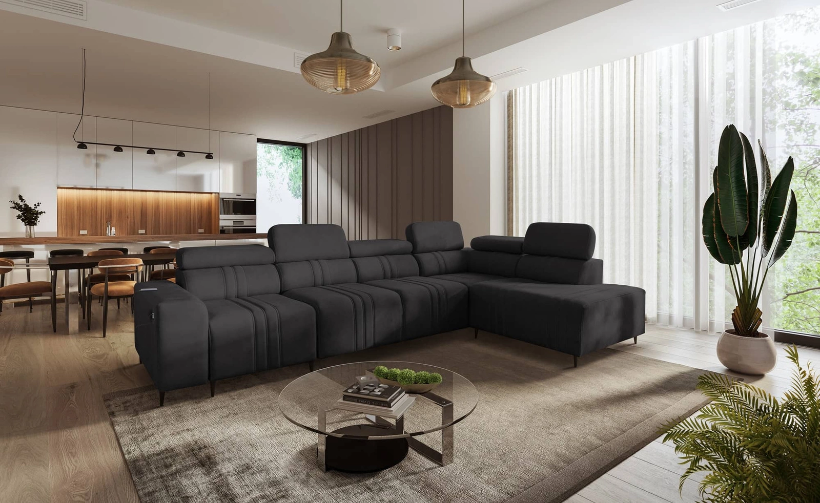 Rohová jednotka Castel XI v grafitové barvě s nastavitelnými opěrkami hlavy je mimořádně elegantní kus nábytku se zajímavou povrchovou úpravou.