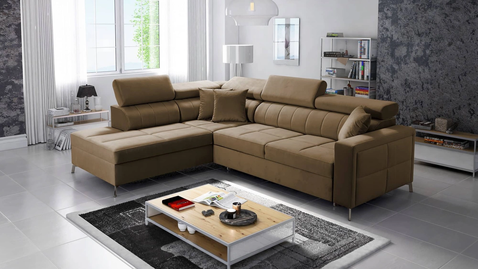 Rohová sedací souprava s funkcí spaní Nausa III světle hnědá levá sametová stylová pohodlná rohová sedací souprava nastavitelné opěrky hlavy nádoba na lůžkoviny
